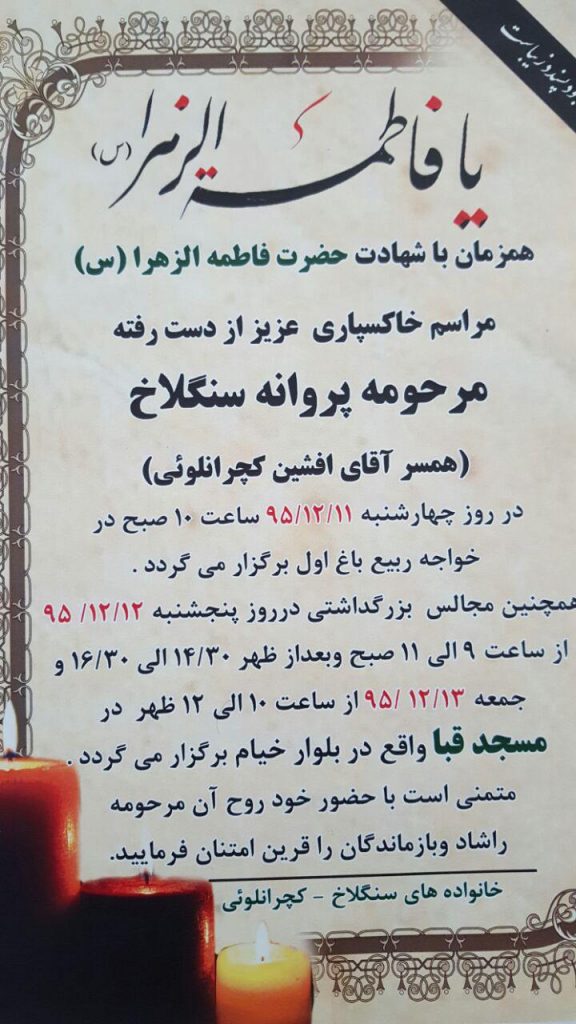 متاسفانه با خبرشدیم سرکارخانم سنگلاخ دفتریارمحترم33مشهد بعدازتحمل دوره ای رنج وبیماری دعوت حق رالبیک گفته اند ، این ضایعه بزرگ رابه همسرگرامی ایشان جناب آقای کچرانلویی سردفترمحترم دفترخانه 33مشهد وهمچنین برادرشان جناب آقای پیمان سنگلاخ دفتریارمحترم دفترخانه 84 مشهد تسلیت عرض می نمائیم و از درگاه خداوند متعال طلب صبر و شکیبایی برای بازماندگان و غفران و مغفرت الهی و علو درجات برای آن مرحومه خواهانیم .