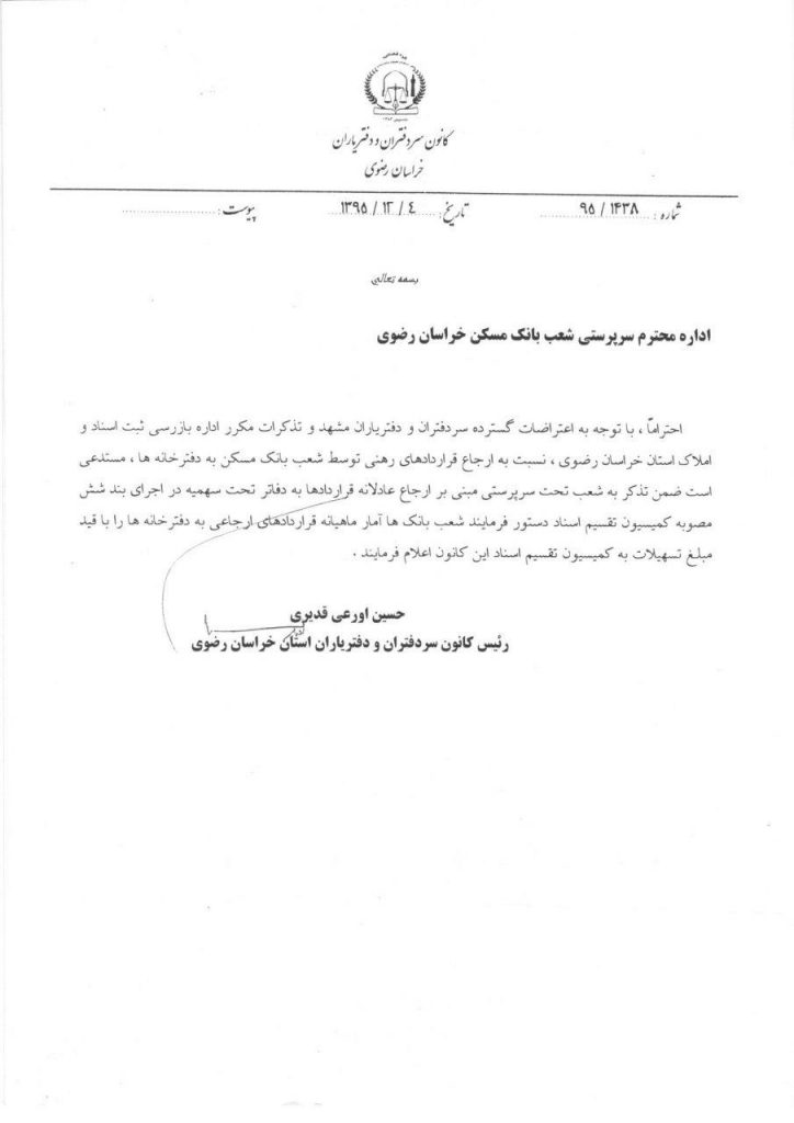 نامه کانون به سرپرستی شعب بانک مسکن خراسان رضوی در خصوص تقسیم اسناد رهنی اخبار سایت بوسیله مدیر به روز رسانی شده در اسفند ۱۰, ۱۳۹۵ 0