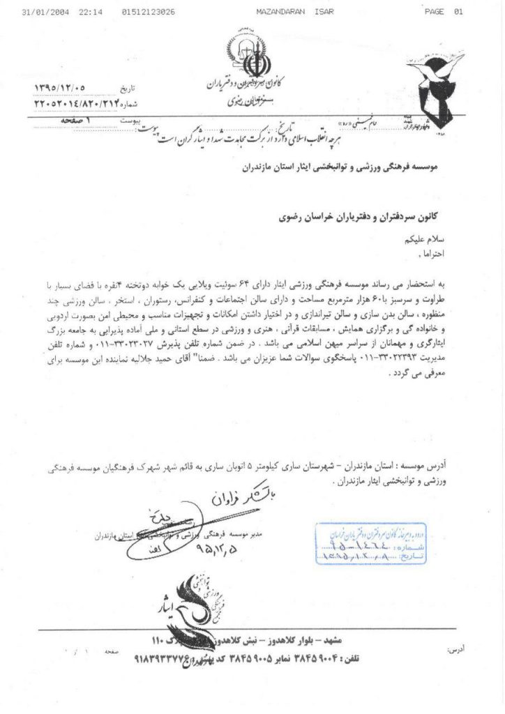 اطلاعیه موسسه فرهنگی ورزشی و توانبخشی ایثار استان مازندران اخبار سایت بوسیله مدیر در اسفند ۱۰, ۱۳۹۵ 0 باستحضار همکاران محترم میرساند همکارانی که تمایل به استفاده از امکانات موسسه مذکور دارند در اسرع وقت جهت رزرو و هماهنگی با آقای جلالیه با شماره همراه 09158300800 تماس حاصل فرمایند .