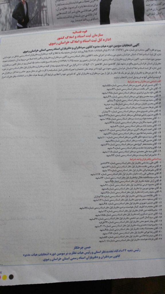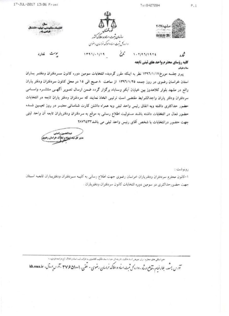 بخشنامه اداره کل ثبت اسناد و املاک خراسان رضوی در خصوص انتخابات سومین دوره هیات مدیره کانون سردفتران و دفتریاران خراسان رضوی اخبار سایت بوسیله مدیر به روز رسانی شده در فروردین ۲۱, ۱۳۹۶ 0