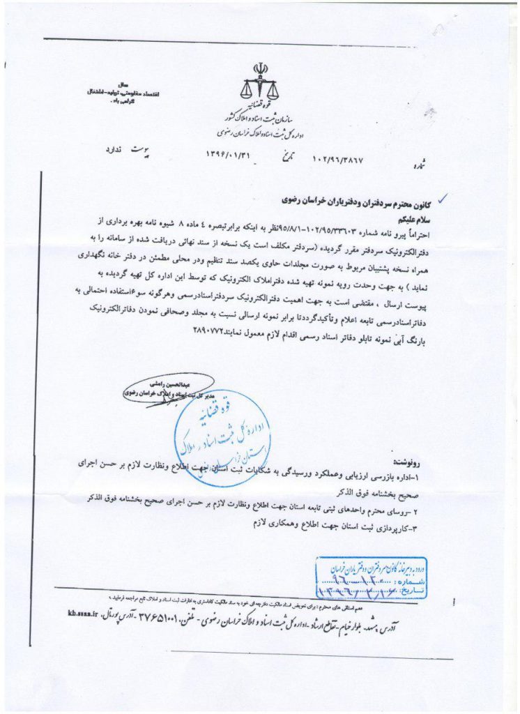 بخشنامه اداره کل ثبت اسناد و املاک خراسان رضوی در خصوص تابلوی دفاتر