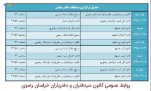 ساعت 22 مورخ 1398/02/22 مسابقات فوتسال جام رمضان با حضور تیم های متعدد از اداره ثبت و کانون سردفتران و دفتریاران خراسان رضوی برگزار گردید در ابتدا تیم بسیج دفتر اسناد رسمی توانست با نتیجه 5 بر 2 مقابل تیم اداره ثبت به پیروزی برسد و تیم کانون سردفتران و دفتریاران خراسان رضوی با نتیجه 10 بر صفر مقابل تیم اجرای ثبت به پیروزی رسید.برنامه بازی به شرح ذیل می باشد.