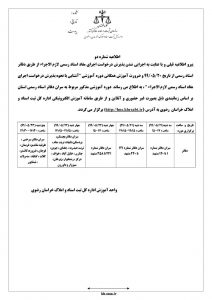 پیرو اطلاعیه قبلی و با عنایت به اجرایی شدن پذیرش درخواست اجرای مفاد اسناد رسمی لازم الجرا از طریق دفاتر اسناد رسمی از تاریخ 1399/05/20 و ضرورت آموزش همگانی دوره آموزشی به اطلاع می رساند دوره آموزش مذکور به سران دفاتر اسناد رسمی استان بر اساس زمان بندی ذیل به صورت آنلاین و از طریق آدرس اینترنتی http://lms.khrsabt.ir برگزار می گردد.
