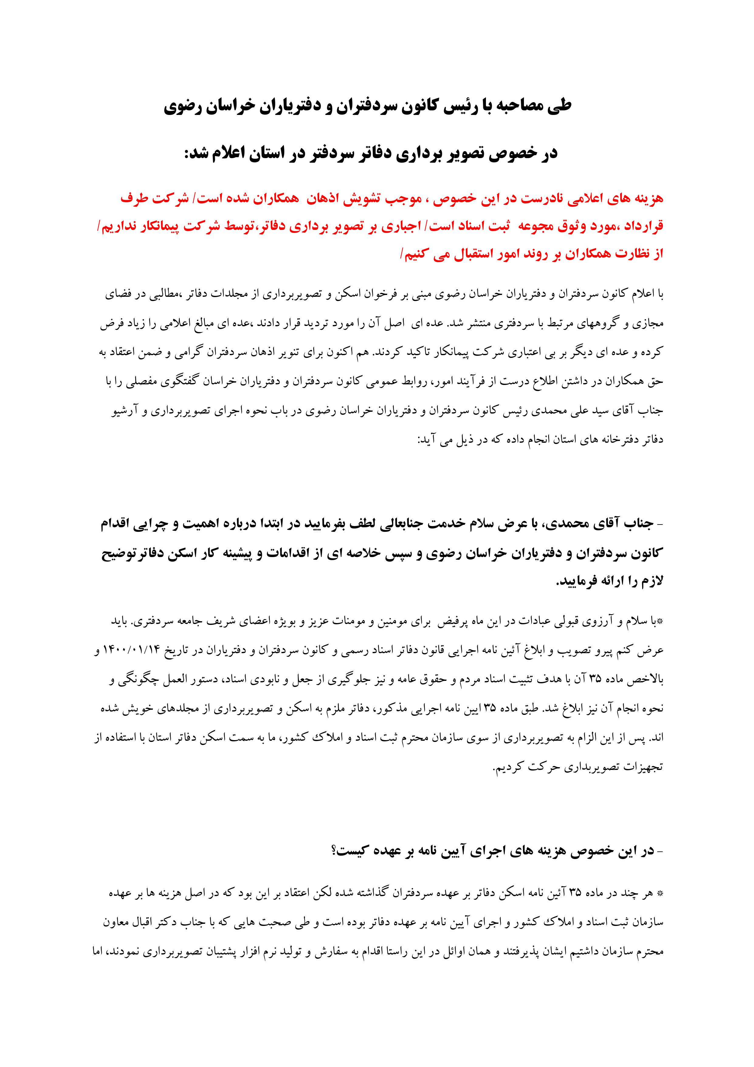 پاسخ به ابهامات اسکن دفاتر اخبار سایتکمیته روابط عمومی ، رسانه و تشریفات بوسیله به روز رسانی شده در فروردین ۲۹, ۱۴۰۱ 0 گفتگو با رئیس کانون سردفتران و دفتریاران خراسان رضوی در مورد پروژه اسکن دفاتر استان 1 2 3 4 5 6 پیوست ها: پاسخ به ابهامات اسکن دفاتر (فایل pdf قابل دریافت) تلگرام اینستاگرام