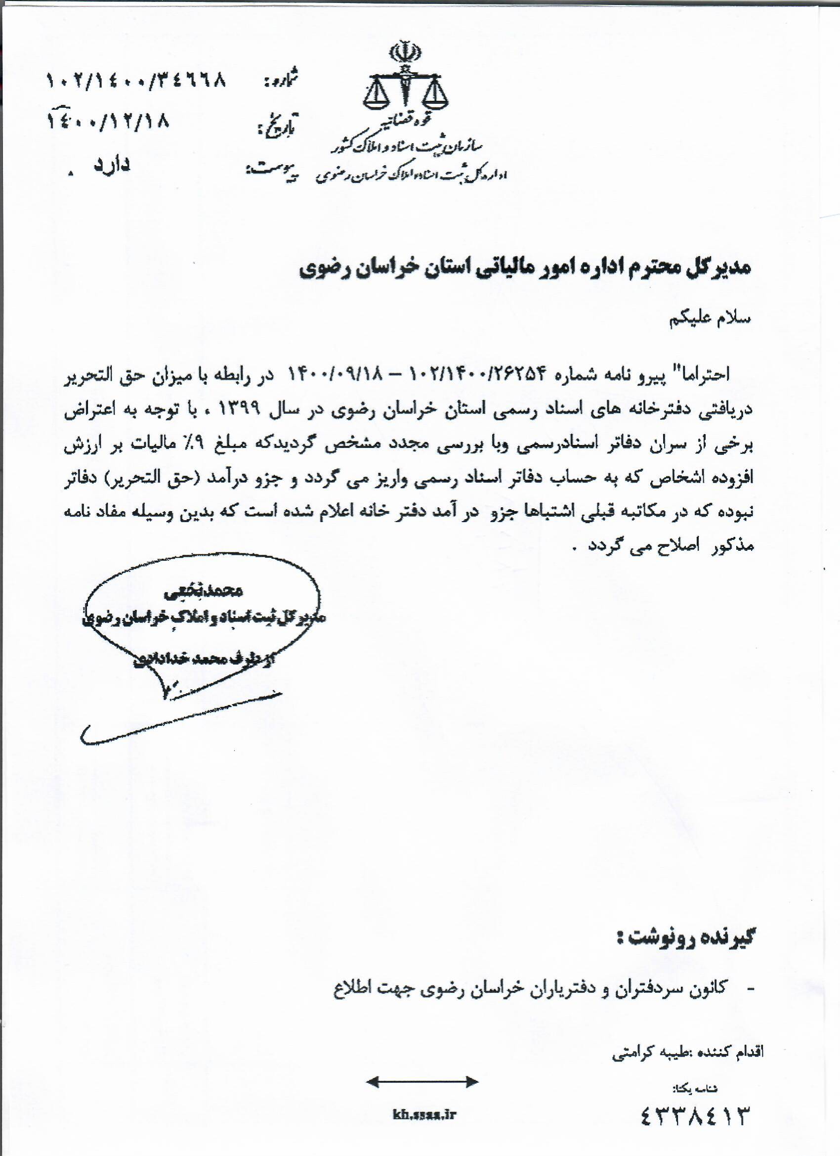 در رابطه با میزان حق التحریر دریافتی دفترخانه های اسناد رسمی استان خراسان رضوی در سال 1399، با توجه به اعتراض برخی از سران دفاتر اسنادرسمی و با بررسی مجدد مشخص گردید که مبلغ 9% مالیات بر ارزش افزوده اشخاص که به حساب دفاتر اسناد رسمی واریز می گردد و جزو درآمد(حق التحریر) دفاتر نبوده که در مکاتبه قبلی اشتباها جزو درآمد دفترخانه اعلام شده اس که بدین وسیله مفادنامه مذکور اصلاح می گردد.