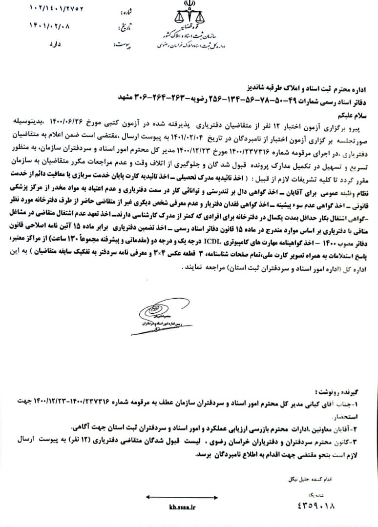 همچنین طبق نامه مورخ 1401/02/08 رییس اداره اسناد و سردفتران اداره کل ثبت اسناد و املاک خراسان رضوی، متقاضیان پذیرفته شده به جهت جلوگیری از مراجعه مکرر به سازمان می بایستی پس از تامین مدارک لازم مندرج در متن نامه، در اسرع وقت به اداره کل ثبت اسناد و املاک خراسان رضوی (اداره امور اسناد و سردفتران) مراجعه نماید.
