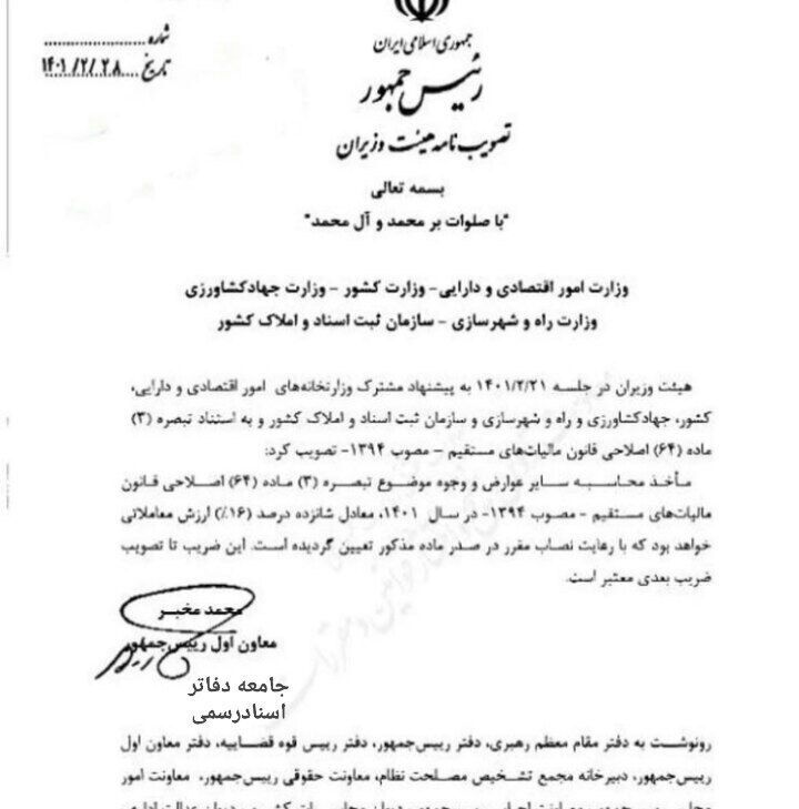 به گزارش روابط عمومی کانون سردفتران و دفتریاران، طبق مصوبه 21/02/1401 هیات وزیران، مأخذ محاسبه سایر عوارض و وجوه موضوع تبصره 3 ماده 34 اصلاحی قانون مالیاتهای مستقیم مصوب 1364 در سال 1401 معادل 16 درصد ارزش معاملاتی خواهد بود.