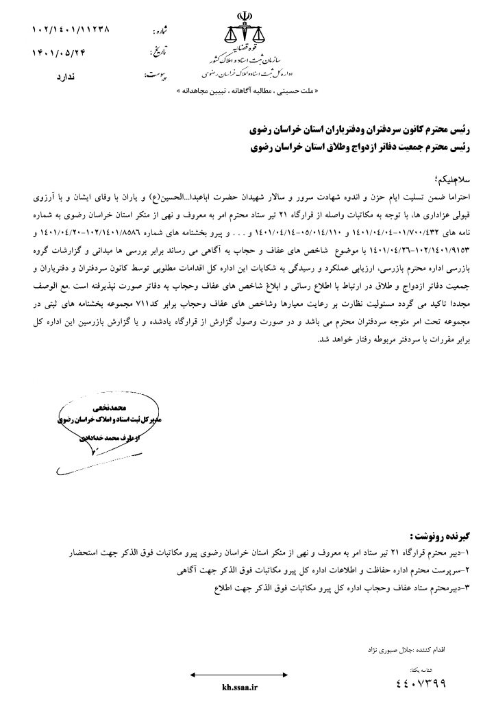 عفاف و حجاب اخبار سایت بوسیله به روز رسانی شده در شهریور ۵, ۱۴۰۱ 0 رعایت معیارها و شاخص های عفاف و حجاب 🔸 قابل توجه همکاران محترم 🔸 تصویر نامه شماره 102/1401/11238 مورخ 1401/5/24 اداره کل محترم ثبت اسناد و املاک خراسان رضوی در خصوص رعایت معیارها و شاخص های عفاف و حجاب به پیوست تقدیم می گردد.