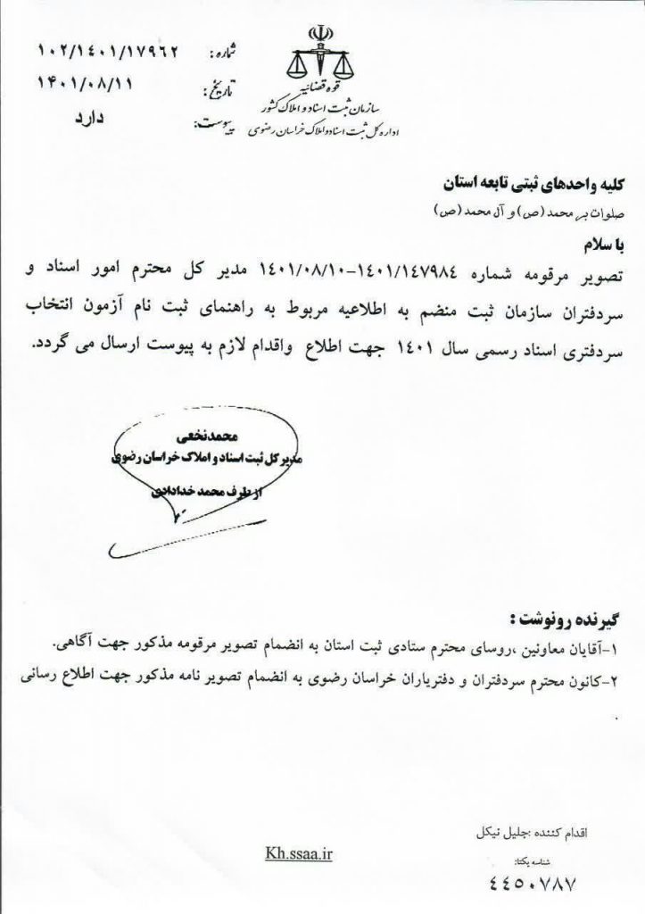 به پیوست تصویر نامه شماره 102/1401/17962 مورخ 1401/08/11 مدیر کل ثبت اسناد و املاک خراسان رضوی جهت استحضار تقدیم می گردد.