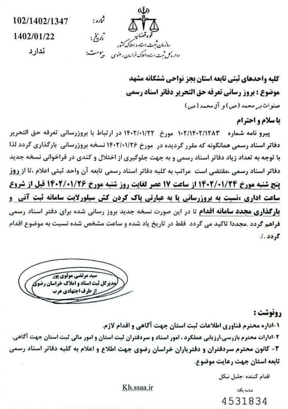 برابر نامه شماره 102/1402/1347 اداره کل ثبت اسناد و املاک خراسان رضوی، جهت استفاده سامانه ثبت آنی از مورخ 1402/01/26 نسبت به بروز رسانی سامانه از ساعت 17 مورخ 1402/01/24 لغایت مورخ 1402/01/26 قبل از شروع ساعت اداری طبق راهنمای پیوست اقدام فرمایند.
