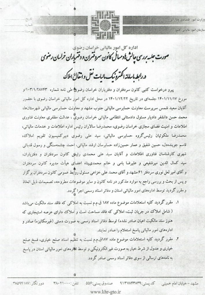 مصوبه فیمابین کانون و اداره کل امور مالیاتی خراسان رضوی اخبار سایتکمیته روابط عمومی ، رسانه و تشریفات بوسیله به روز رسانی شده در اردیبهشت ۶, ۱۴۰۲ 0 اطلاعیه قابل توجه همکاران محترم مصوبه فیمابین کانون سردفتران و دفتریاران خراسان رضوی و اداره کل امور مالیاتی خراسان رضوی در رابطه با سامانه الکترونیک مالیات نقل و انتقال املاک جهت اطلاع و اقدام به پیوست تقدیم می گردد. ⚜️روابط عمومی کانون سردفتران و دفتریاران خراسان رضوی⚜️