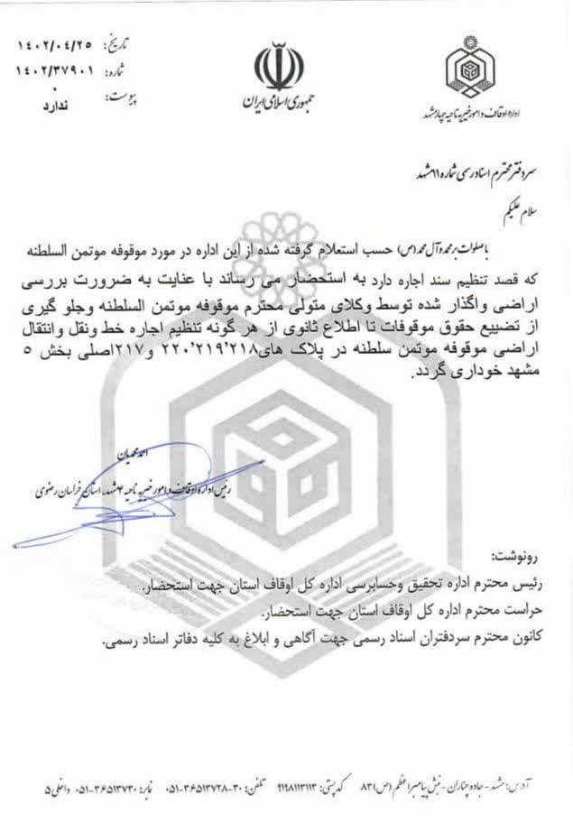 تصویر مرقومه اداره اوقاف و امور خیریه ناحیه ۴ مشهد اخبار سایتکمیته روابط عمومی ، رسانه و تشریفات بوسیله aliramezani7597 به روز رسانی شده در مرداد ۲۶, ۱۴۰۲ 0 تصویر مرقومه اداره اوقاف و امور خیریه ناحیه ۴ مشهد مبنی بر عدم تنظیم هر گونه سند اجاره خط و نقل و انتقال اراضی موقوفه موتمن السلطنه در پلاک های ۲۱۸ _ ۲۱۹ _ ۲۲۰ _ ۲۱۷ _ اصلی بخش ۵ مشهد. ⚜️روابط عمومی کانون سردفتران و دفتریاران خراسان رضوی⚜️ 🌐 سایت 📱 ایتا 📱 سروش 📱 تلگرام 📱 اینستاگرام