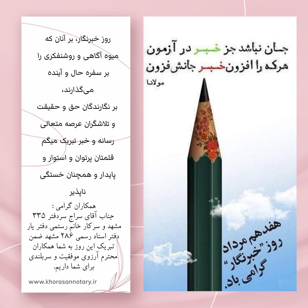 جناب آقای سراج سردفتر ۳۳۵ مشهد و سرکار خانم رستمی دفتر یار دفتر اسناد رسمی 286 مشهد، ضمن تبریک این روز به شما همکاران محترم آرزوی موفقیت و سربلندی برای شما داریم.