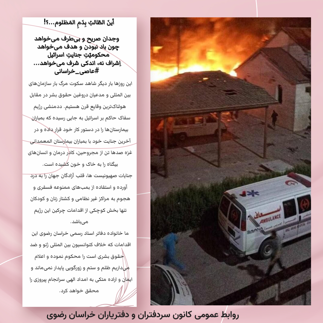 این روزها بار دیگر شاهد سکوت مرگ بار سازمانهای بین المللی و مدعیان دروغین حقوق بشر در مقابل هولناکترین وقایع قرن هستیم. ددمنشی رژیم سفاک حاکم بر اسرائیل به جایی رسیده که بمباران بیمارستانها را در دستور کار خود قرار داده و در آخرین جنایت خود با بمباران بیمارستان المعمدانی غزه صدها تن از مجروحین، کادر درمان و انسانهای بیگناه را به خاک و خون کشیده است.