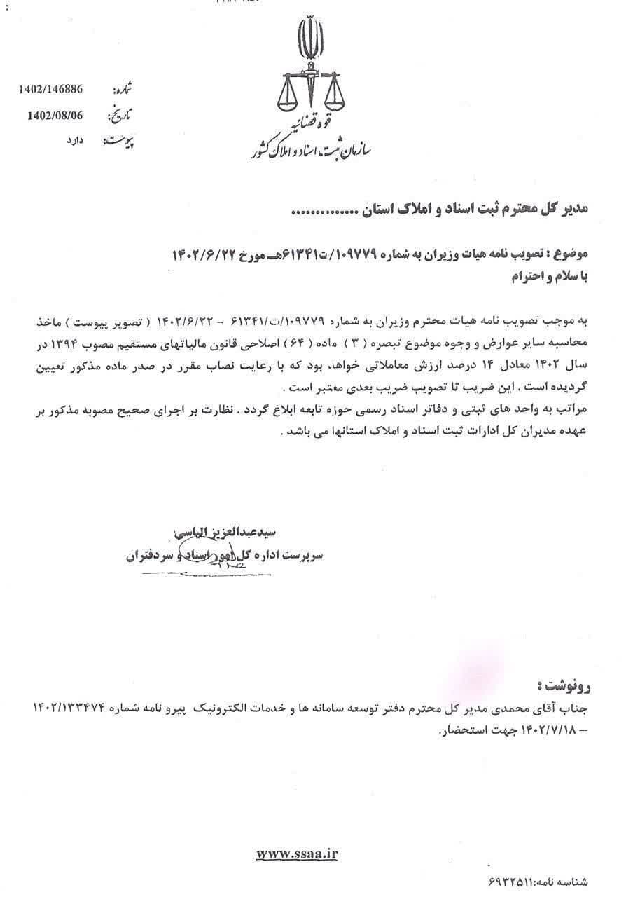 ابلاغ اداره کل امور اسناد و سردفتران در خصوص مصوبه مورخ ۱۴۰۲/۶/۲۲ هیات وزیران [ ماخذ محاسبه سایر عوارض و وجوه موضوع تبصره ۳ ماده ۶۴ اصلاحی ق.م.م معادل ۱۴ درصد ارزش معاملاتی جهت اجرا در سال ۱۴۰۲ ] از روز دوشنبه هشتم آبان ماه لازم الاجراء می باشد.