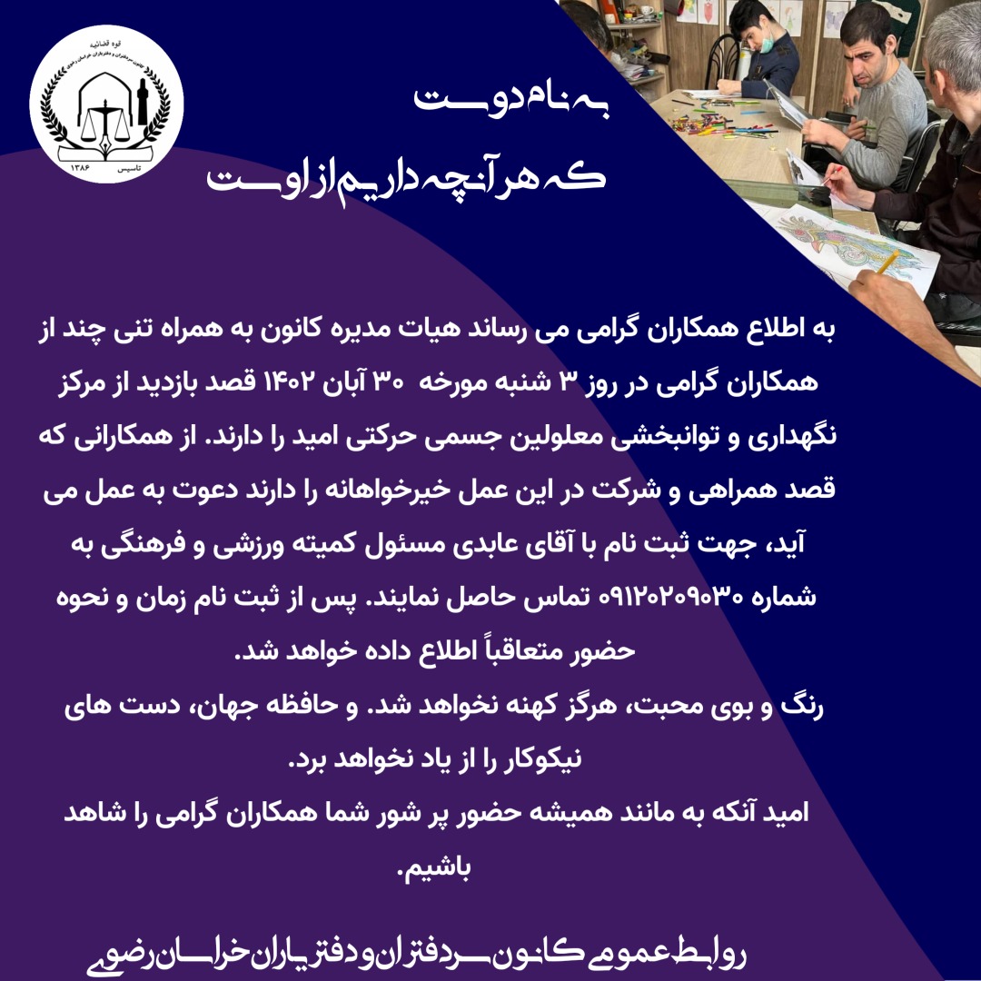 به اطلاع همکاران گرامی می رساند هیئت مدیره کانون به همراه تنی چند از همکاران گرامی در روز سه شنبه مورخه ۳۰ آبان ۱۴۰۲ قصد بازدید از مرکز نگهداری و توانبخشی معلولین جسمی حرکتی امید را دارند. از همکارانی که قصد همراهی و شرکت در این عمل خیرخواهانه را دارند دعوت به عمل می آید، جهت ثبت نام با آقای عابدی مسئول کمیته ورزشی و فرهنگی به شماره ۰۹۱۲۰۲۰۹۰۳۰ تماس حاصل نمایند. پس از ثبت نام زمان و نحوه حضور متعاقباً اطلاع داده خواهد شد.