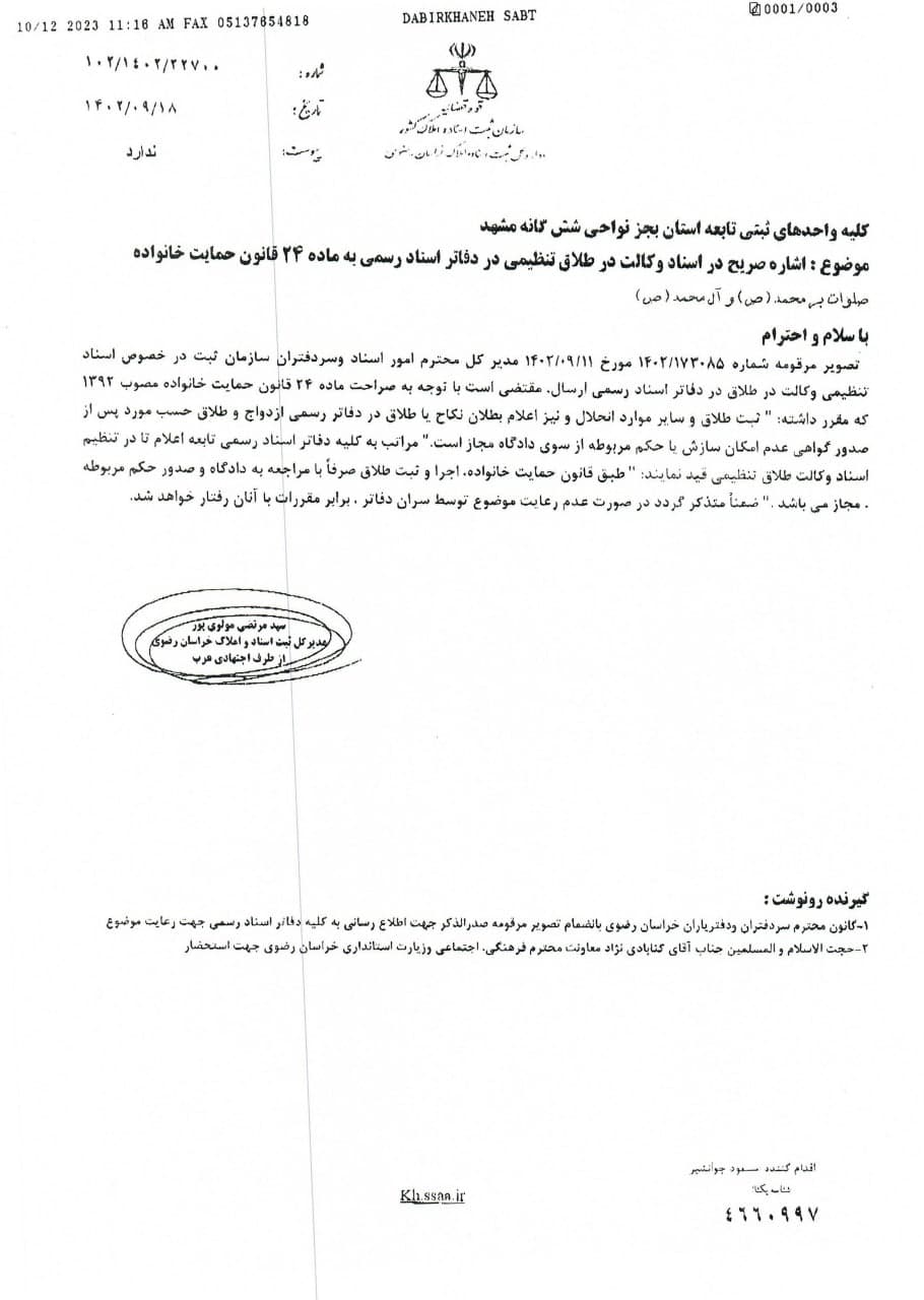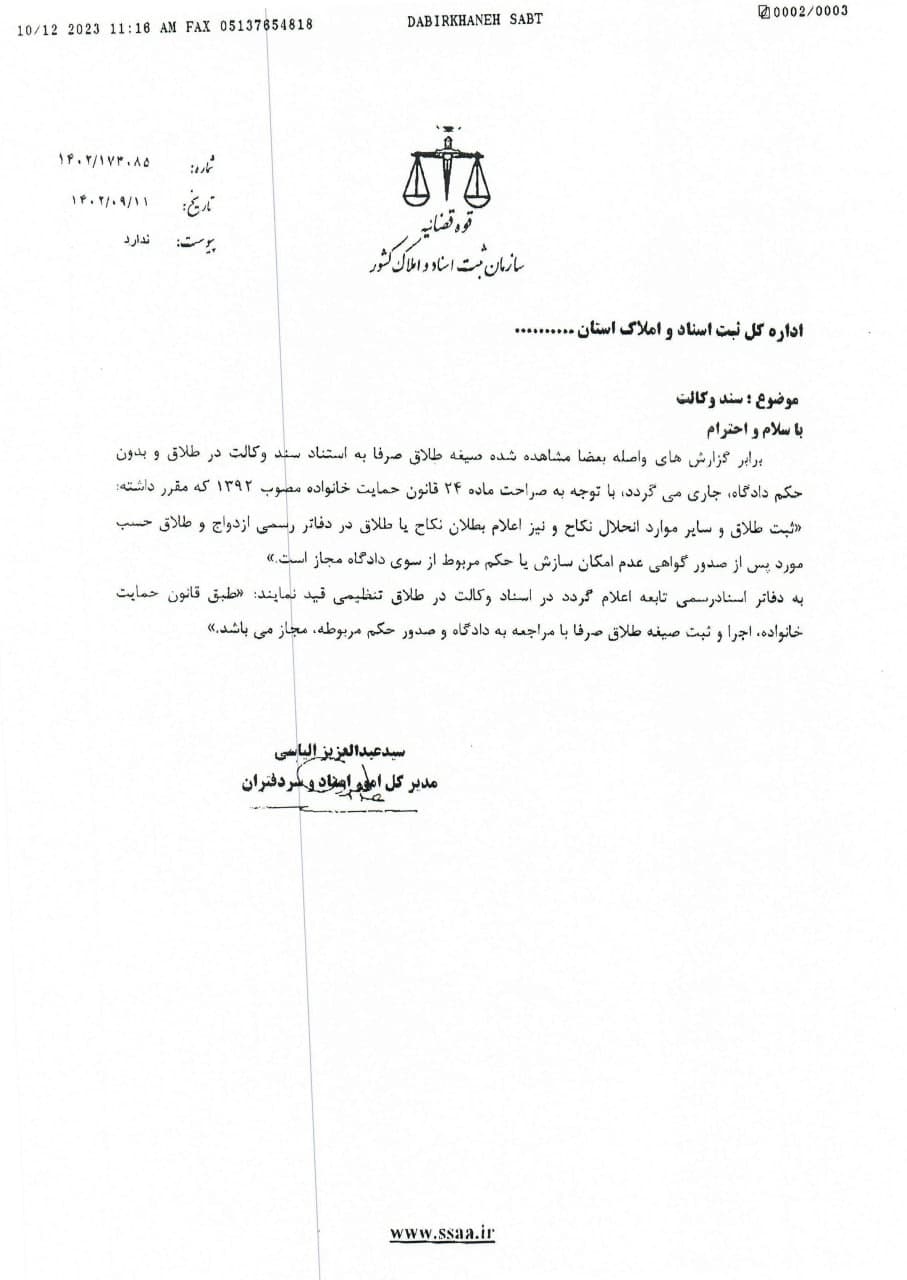 تصویر مرقومه مدیر کل محترم امور اسناد مبنی بر درج عبارات: ((طبق قانون حمایت خانواده، اجرا و ثبت طلاق صرفاً با مراجعه به دادگاه و صدور حکم مربوطه مجاز می باشد.)) در وکالت نامه های طلاق تنظیمی در دفاتر اسناد رسمی.