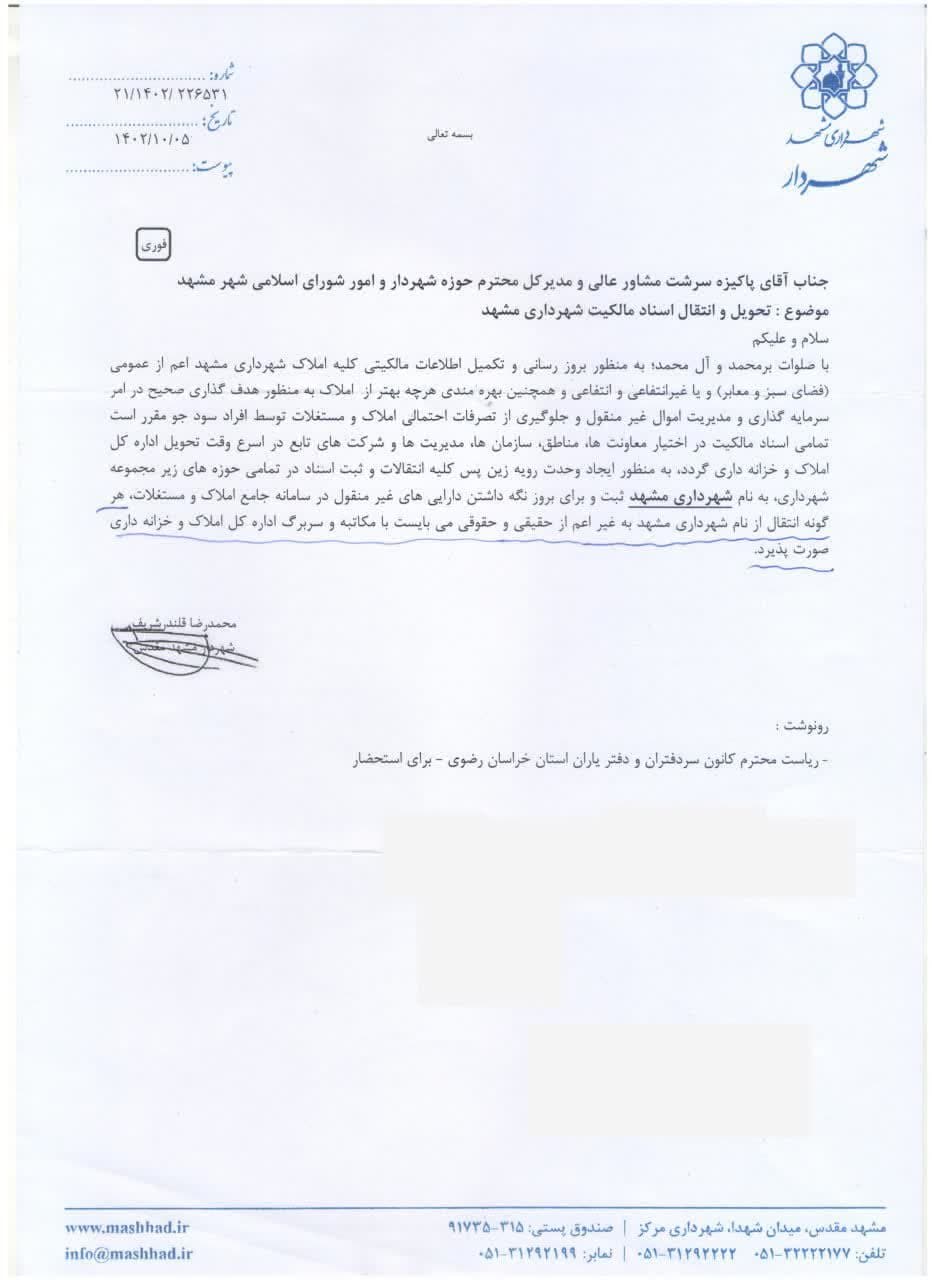 تصویر نامه شهردار محترم مشهد با موضوع: