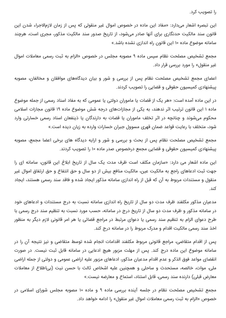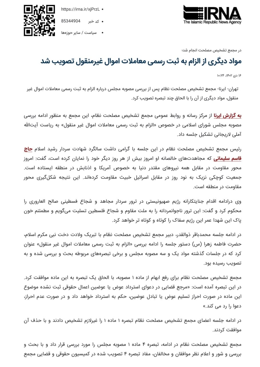 تصویب مصوبه مجلس درباره الزام به ثبت رسمی معاملات اموال غیر منقول اخبار سایتکمیته روابط عمومی ، رسانه و تشریفات بوسیله مدیر سایت به روز رسانی شده در دی ۱۷, ۱۴۰۲ 0 ((خبرگزاری جمهوری اسلامی ۱۶ دیماه ۱۴۰۲)) مجمع تشخیص مصلحت نظام پس از بررسی مصوبه مجلس درباره الزام به ثبت رسمی معاملات اموال غیر منقول، مواد دیگری از آن را با الحاق چند تبصره تصویب کرد. ⚜️روابط عمومی کانون سردفتران و دفتریاران خراسان رضوی⚜️ 🌐 سایت 📱 ایتا 📱 سروش 📱 تلگرام 📱 اینستاگرام