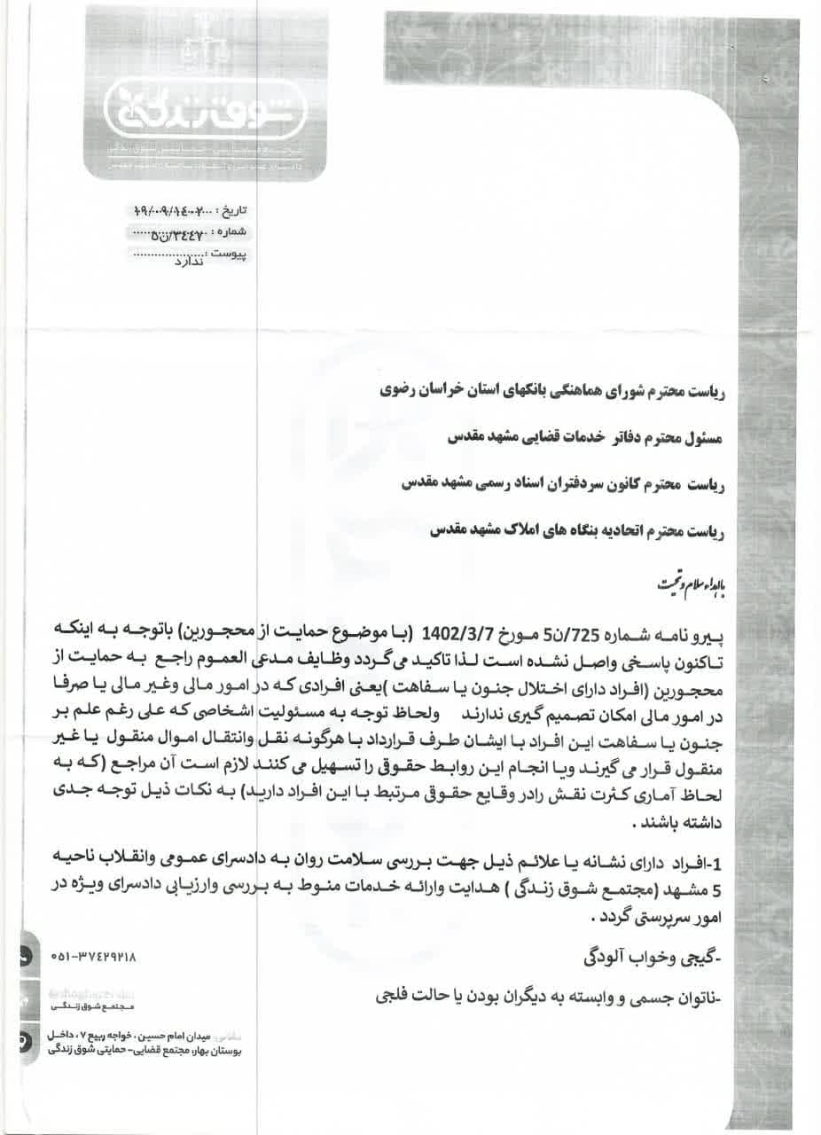 نامه معاون محترم دادستان و سرپرست ناحیه ۵ دادسرای عمومی و انقلاب مشهد اخبار سایتکمیته روابط عمومی ، رسانه و تشریفات بوسیله مدیر سایت به روز رسانی شده در دی ۲۰, ۱۴۰۲ 0 اطلاعیه نامه شماره ۳۴۴۷/ن۵ معاون دادستان و سرپرست ناحیه ۵ دادسرای عمومی و انقلاب مشهد با موضوع حمایت از محجورین (افراد دارای اختلال جنون یا سفاهت) جهت استحضار همکاران گرامی تقدیم می گردد. ⚜️روابط عمومی کانون سردفتران و دفتریاران خراسان رضوی⚜️ 🌐 سایت 📱 ایتا 📱 سروش 📱 تلگرام 📱 اینستاگرام