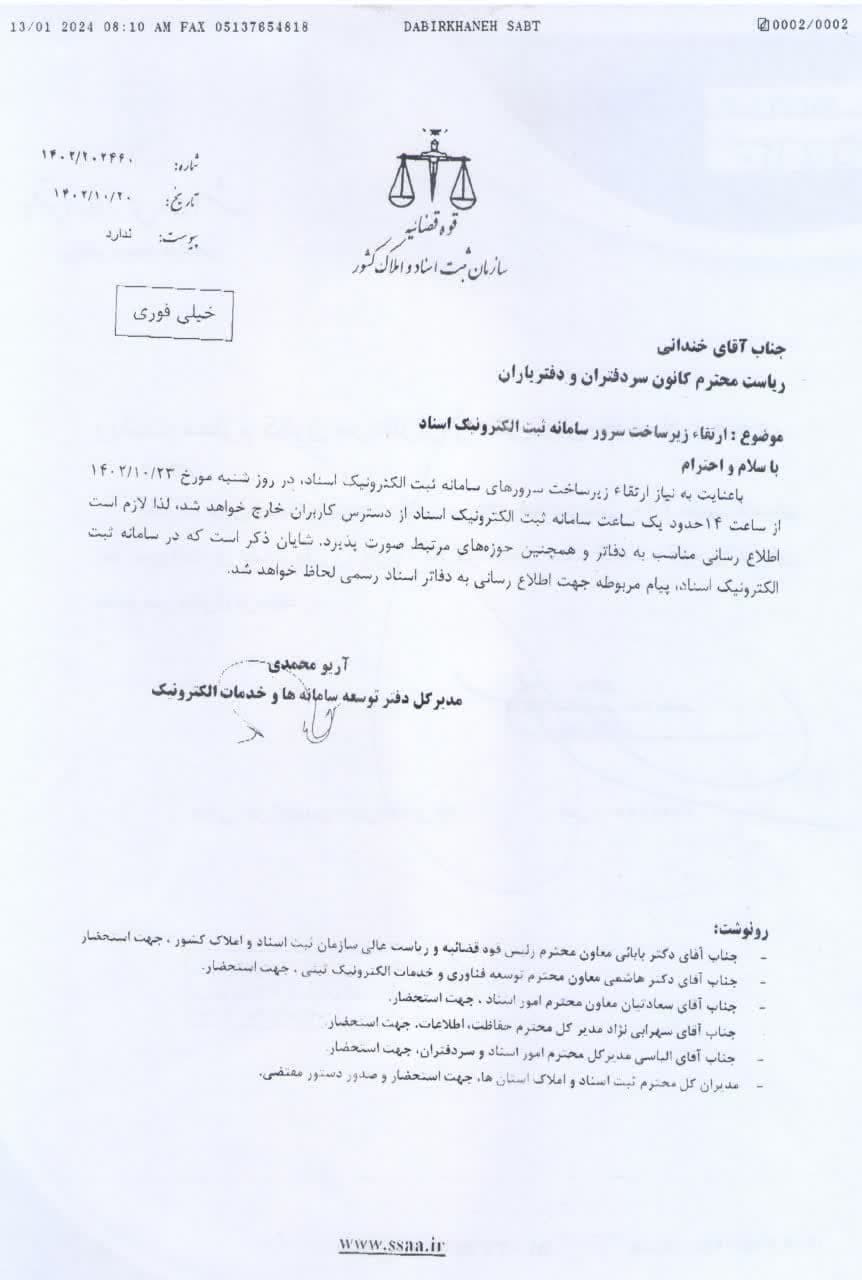 تصویر مرقومه مدیر کل محترم دفتر توسعه سامانه ها و خدمات الکترونیک اسناد اخبار سایتکمیته روابط عمومی ، رسانه و تشریفات بوسیله مدیر سایت به روز رسانی شده در دی ۲۳, ۱۴۰۲ 0 تصویر مرقومه شماره ۱۴۰۲/۲۰۲۴۶۰ مدیر کل دفتر توسعه سامانه ها و خدمات الکترونیک اسناد با موضوع از دسترس خارج شدن سامانه ثبت الکترونیک اسناد در روز شنبه مورخ ۲۳ / ۱۰ / ۱۴۰۲ از ساعت ۱۴ ⚜️روابط عمومی کانون سردفتران و دفتریاران خراسان رضوی⚜️ 🌐 سایت 📱 ایتا 📱 سروش 📱 تلگرام 📱 اینستاگرام