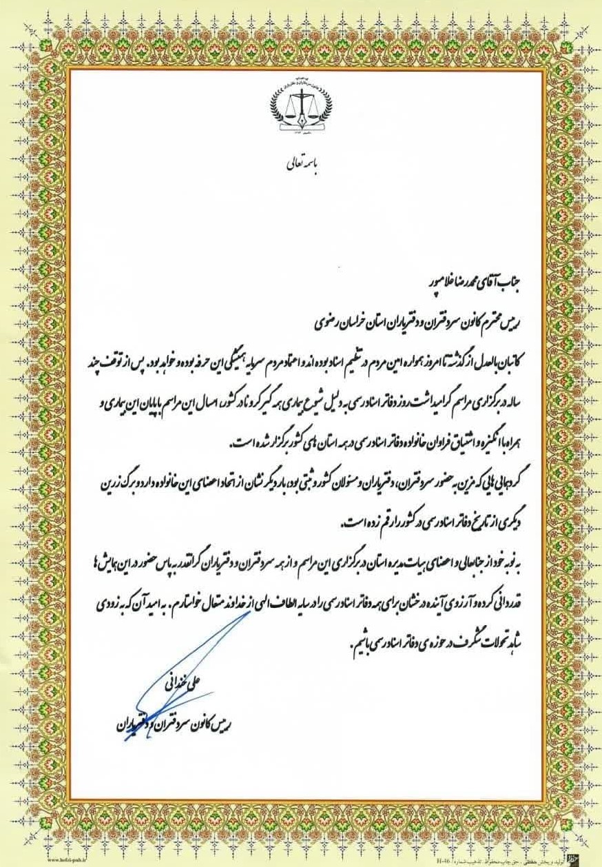 لوح تقدیر از رئیس، اعضای هیئت مدیره و کانون سردفتران و دفتریاران خراسان رضوی اخبار سایتکمیته روابط عمومی ، رسانه و تشریفات بوسیله مدیر سایت به روز رسانی شده در دی ۲۵, ۱۴۰۲ 0 لوح تقدیر رئیس هیئت مدیره کانون مرکز از رئیس، اعضای هیئت مدیره و کانون سردفتران و دفتریاران خراسان رضوی بدلیل برگزاری مراسم بزرگداشت روزدفاتر اسناد رسمی (مورخ ۱۴۰۲/۱۰/۰۹) ⚜️روابط عمومی کانون سردفتران و دفتریاران خراسان رضوی⚜️ 🌐 سایت 📱 ایتا 📱 سروش 📱 تلگرام 📱 اینستاگرام