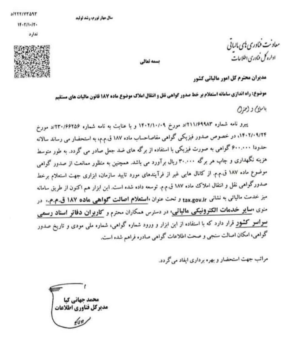 مرقومه شماره ٢٢٢/٧٣۵٩٣/د مورخ ١۴٠٢/١٠/٢٠ مدیرکل فناوری اطلاعات در خصوص راه اندازی سامانه استعلام برخط صدور گواهی نقل و انتقال موضوع ماده ١٨٧ قانون مالیاتهای مستقیم