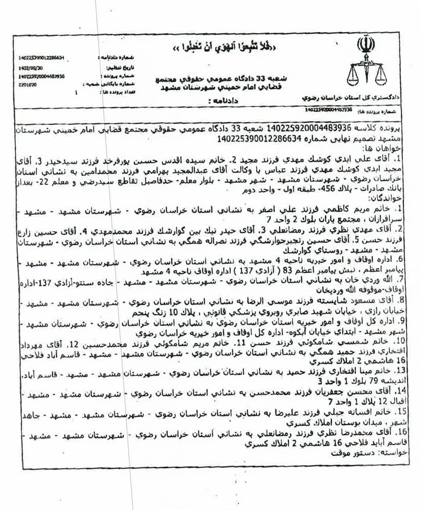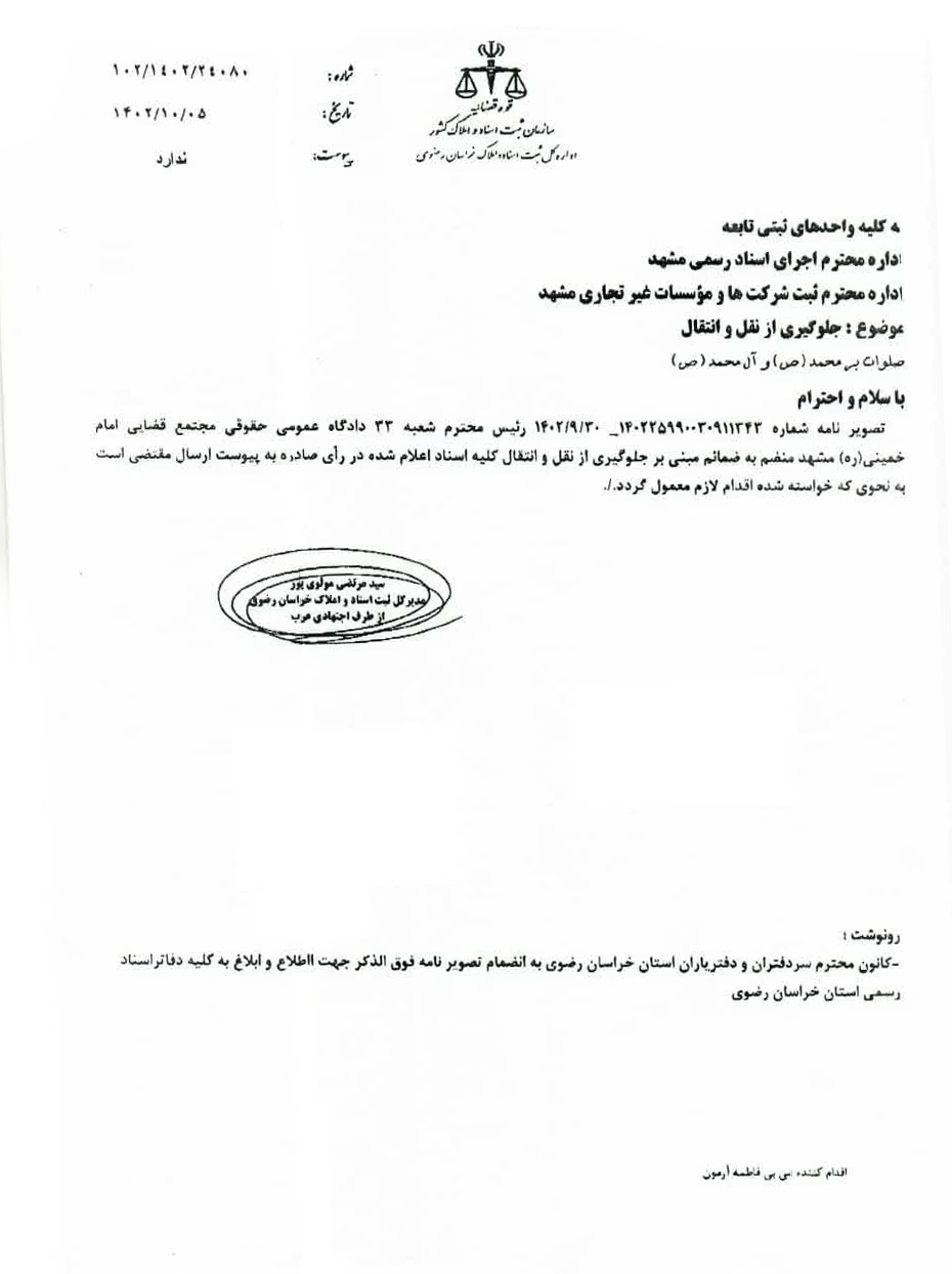 تصویر نامه شماره 102/1402/24080 مدیر کل ثبت اسناد و املاک خراسان رضوی و نامه شماره 140225990030911343 رئیس محترم شعبه ۳۳ دادگاه عمومی حقوقی مجتمع قضایی امام خمینی (ره) منظم به ضمائم مبنی بر جلوگیری از نقل و انتقال کلیه اسناد اعلام شده در رای صادره جهت استحضار دفاتر اسناد رسمی.