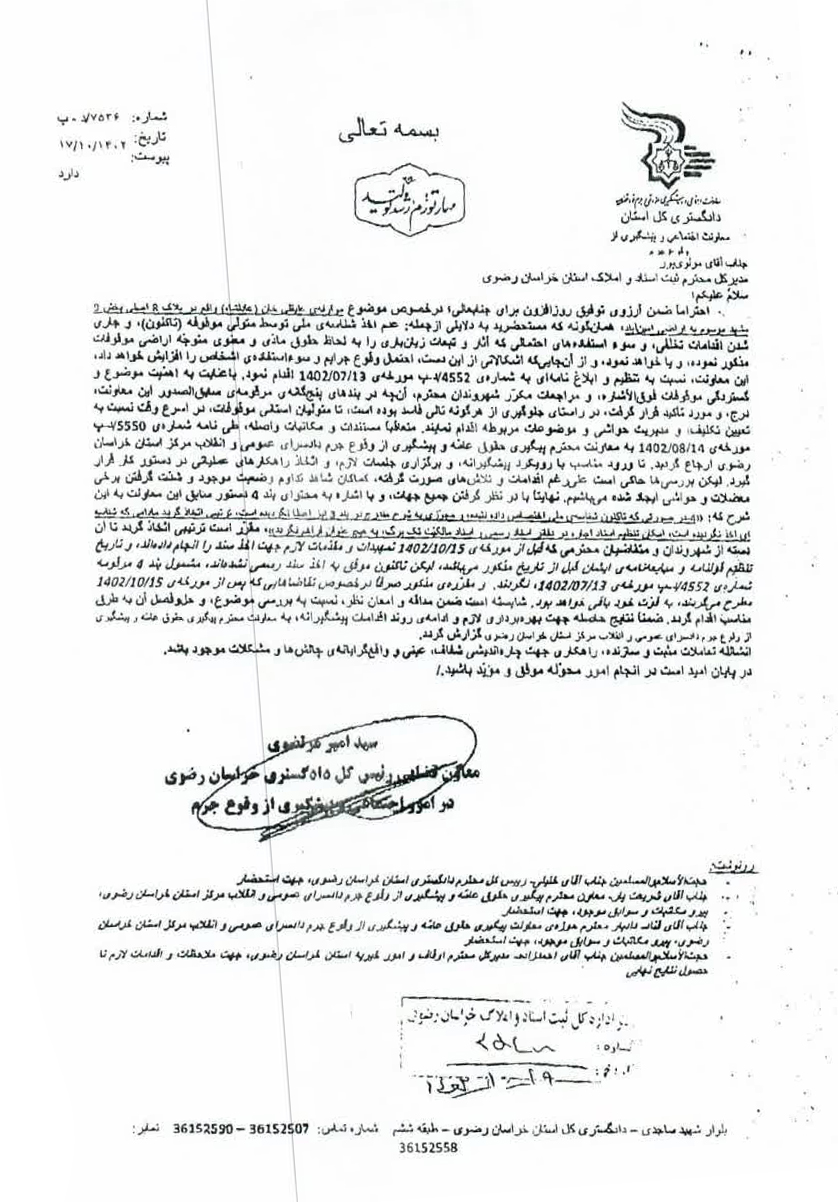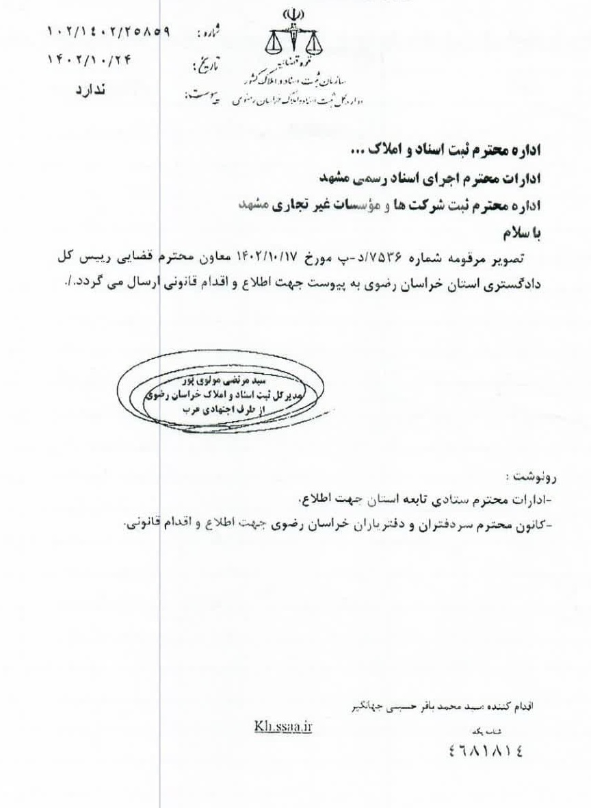تصویر مرقومه شماره ۱۰۲/۱۴۰۲/۲۵۸۵۹ مورخ ۱۴۰۲/۱۰/۲۴ مدیر کل ثبت اسناد و املاک خراسان رضوی و نامه شماره ۷۵۳۶/د-ب مورخ ۱۴۰۲/۱۰/۱۷ معاون محترم قضایی رئیس کل دادگستری استان در رابطه با موقوفه عادلشاه جهت استحضار همکاران و رعایت مفاد آن