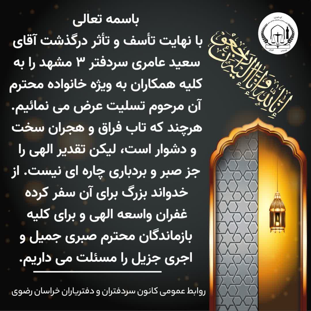 با نهایت تأسف و تأثر درگذشت آقای سعید عامری سردفتر ۳ مشهد را به کلیه همکاران به ویژه خانواده محترم آن مرحوم تسلیت عرض می نمائیم.