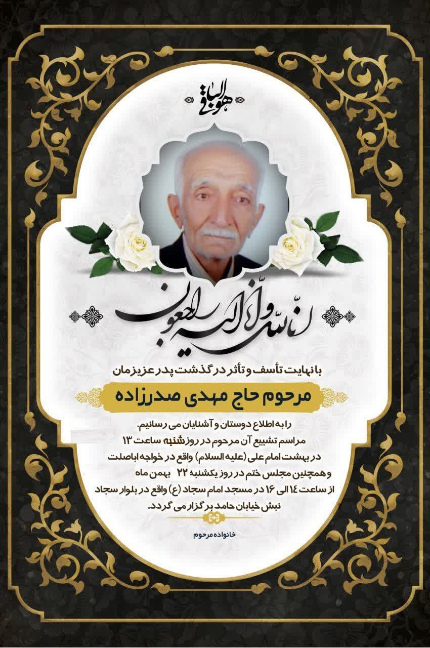 در کمال تأسف باخبر شدیم حاج مهدی صدر زاده (دفتریار اسبق ۵۱ مشهد) دار فانی را وداع گفتند.