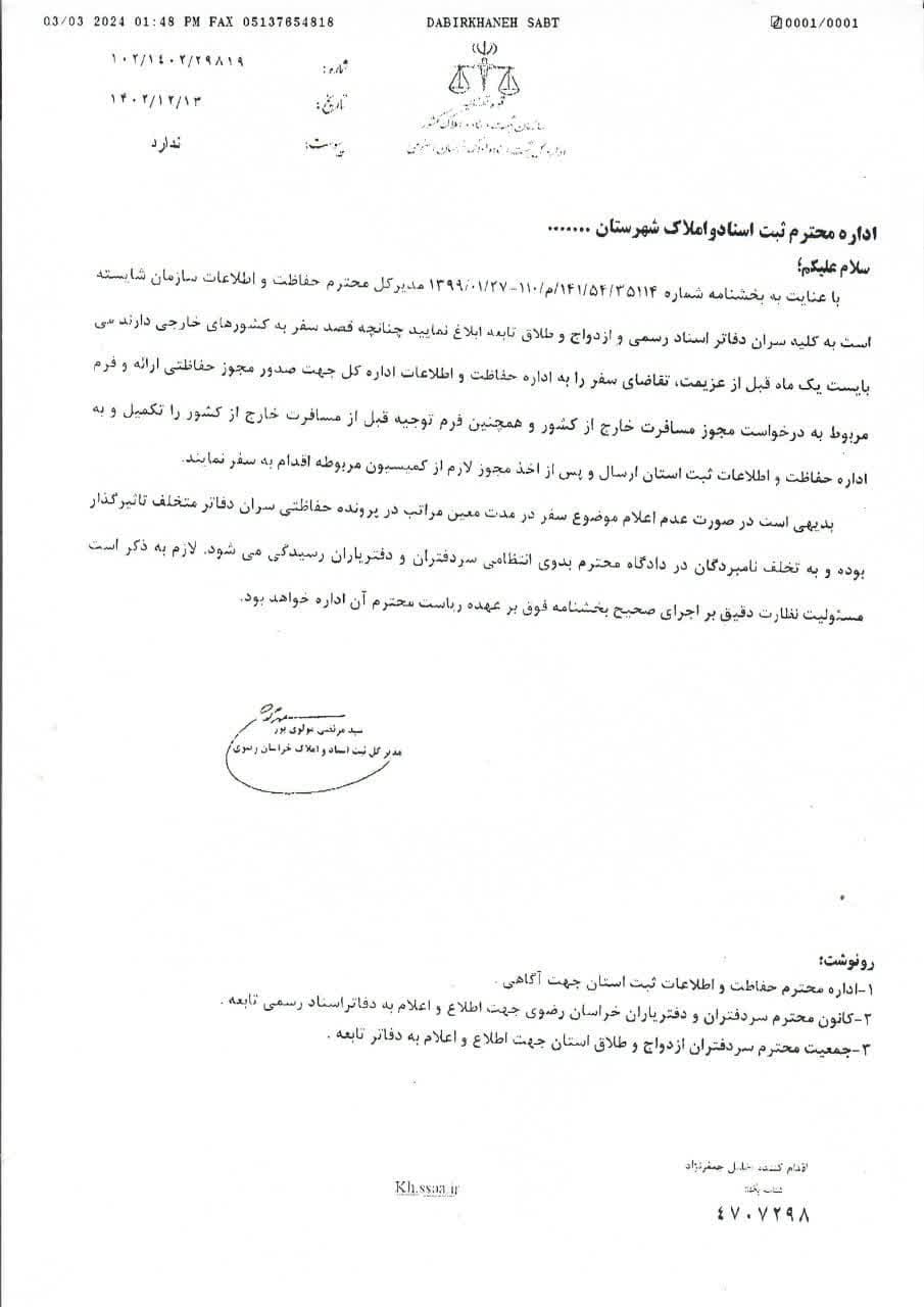 تصویر نامه شماره ۱۰۲/۱۴۰۲/۲۹۸۱۹ مورخ ۱۴۰۲/۱۲/۱۳ مدیر کل محترم ثبت استان با موضوع بخشنامه شماره ۳۵۱۱۴/ ۵۴ / ۱۴۱ / م / ۱۱۰ مورخ ۱۳۹۹/۰۱/۲۷ مدیر کل محترم حفاظت و اطلاعات سازمان مبنی بر اینکه: ((کلیه سران دفاتر اسناد رسمی که قصد سفر به کشور های خارجی را دارند می بایست یک ماه قبل از عزیمت، تقاضای سفر را به اداره حفاظت و اطلاعت اداره کل جهت صدور مجوز حفاظتی ارائه و فرم مربوط به در خواست مجوز خارج از کشور و همچنین فرم توجیه قبل از مسافرت خارج از کشور را تکمیل و به اداره حفاظت و اطلاعات ثبت استان ارسال و پس از اخذ مجوز لازم از کمیسیون مربوطه اقدام به سفر نمایند.))