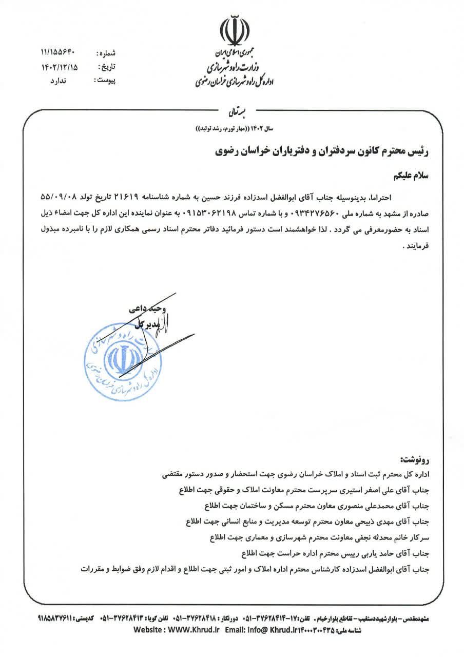 معرفی آقای ابوالفضل اسد زاده به عنوان نماینده اداره کل راه و شهر سازی خراسان رضوی اخبار سایتکمیته روابط عمومی ، رسانه و تشریفات بوسیله مدیر سایت به روز رسانی شده در اسفند ۲۲, ۱۴۰۲ 0 تصویر نامه شماره ۱۱/۱۵۵۶۴۰ مورخ ۱۴۰۲/۱۲/۱۵ اداره کل راه و شهر سازی خراسان رضوی مبنی بر معرفی آقای ابوالفضل اسد زاده به عنوان نماینده آن اداره کل ⚜️روابط عمومی کانون سردفتران و دفتریاران خراسان رضوی⚜️ 🌐 سایت 📱 ایتا 📱 سروش 📱 تلگرام 📱 اینستاگرام