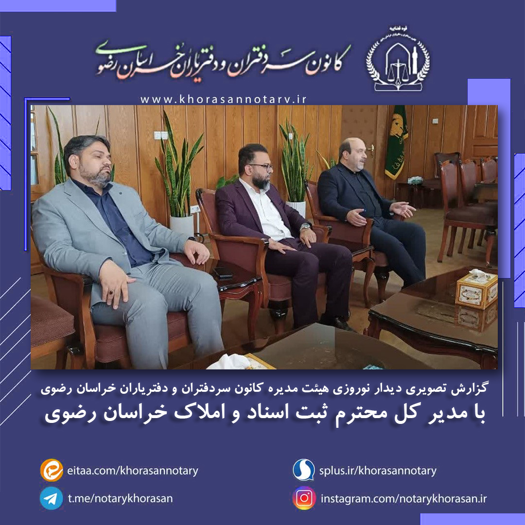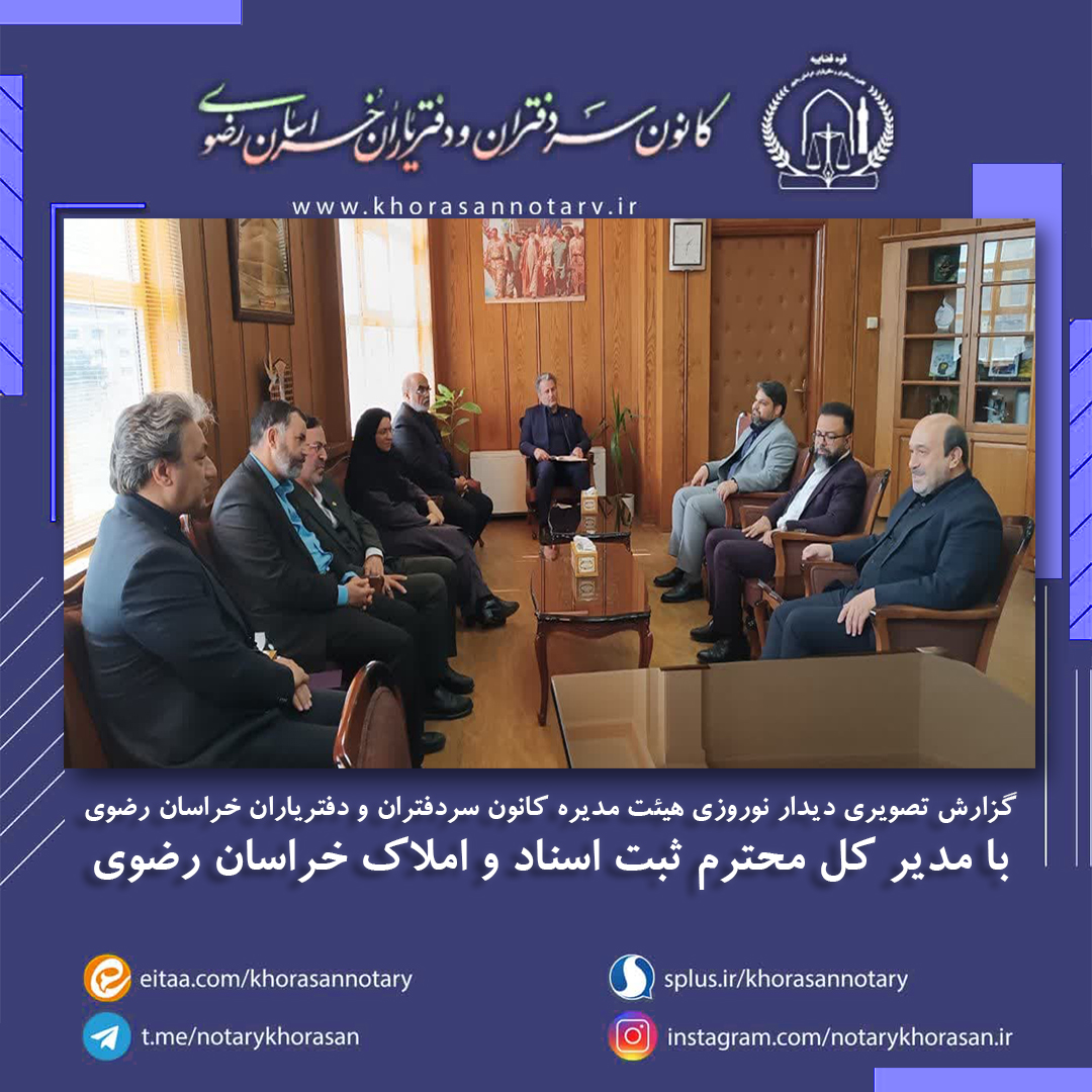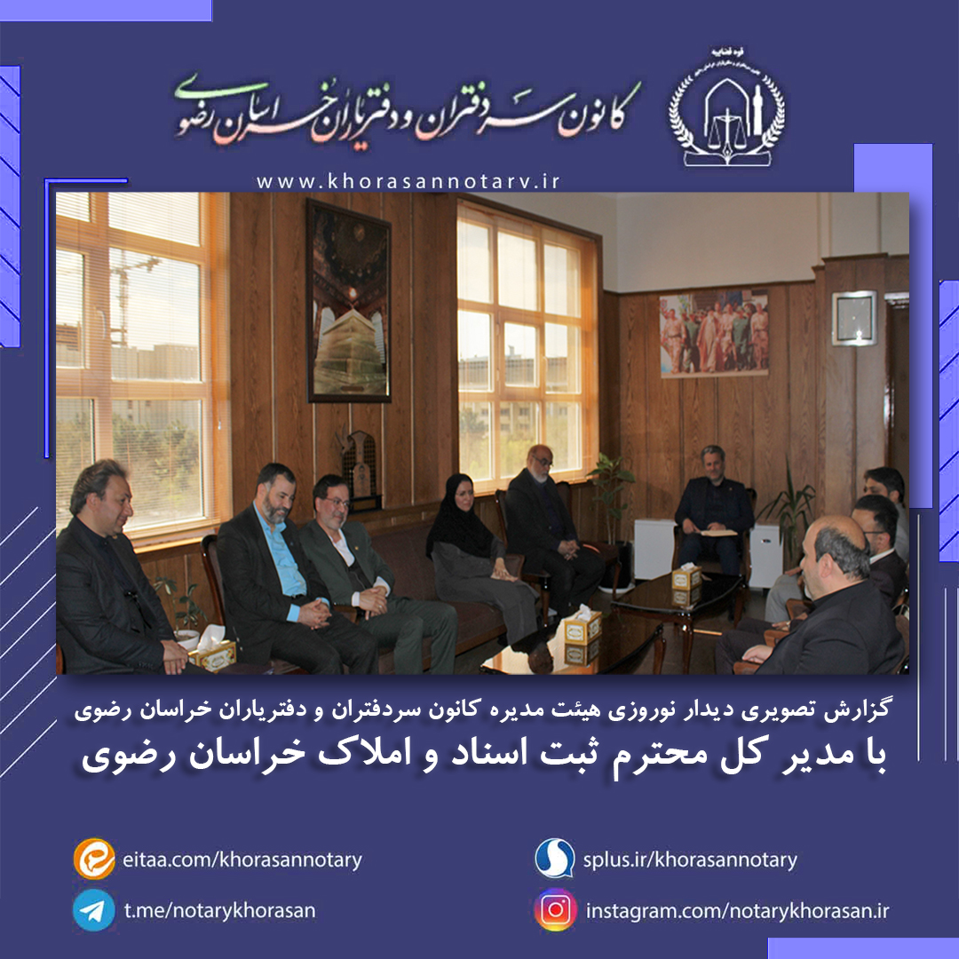 دیدار نوروزی هیئت مدیره کانون با مدیر کل محترم ثبت اسناد و املاک خراسان رضوی اخبار سایتکمیته روابط عمومی ، رسانه و تشریفات بوسیله مدیر سایت به روز رسانی شده در فروردین ۱۷, ۱۴۰۳ 0 ❇️ گزارش تصویری دیدار نوروزی هیئت مدیره کانون سردفتران و دفتریاران خراسان رضوی با مدیر کل محترم ثبت اسناد و املاک خراسان رضوی ❇️ ⚜️روابط عمومی کانون سردفتران و دفتریاران خراسان رضوی⚜️ 🌐 سایت 📱 ایتا 📱 سروش 📱 تلگرام 📱 اینستاگرام