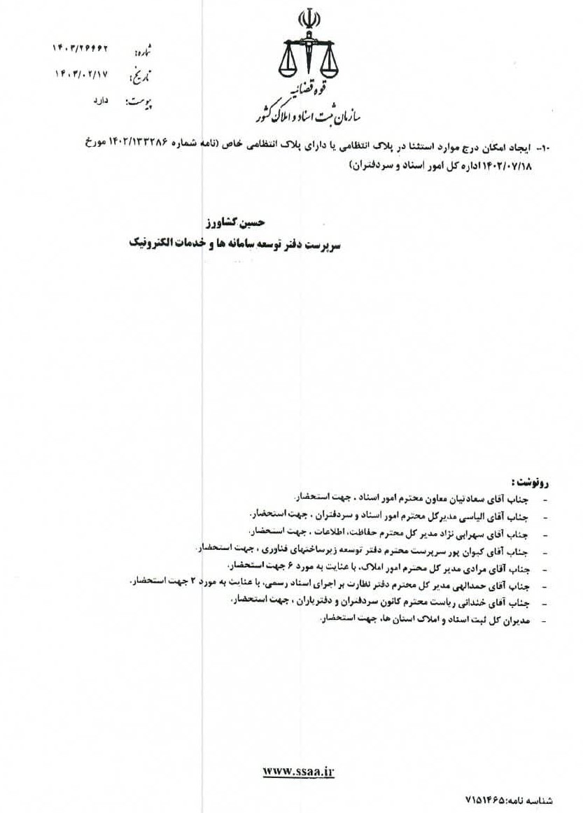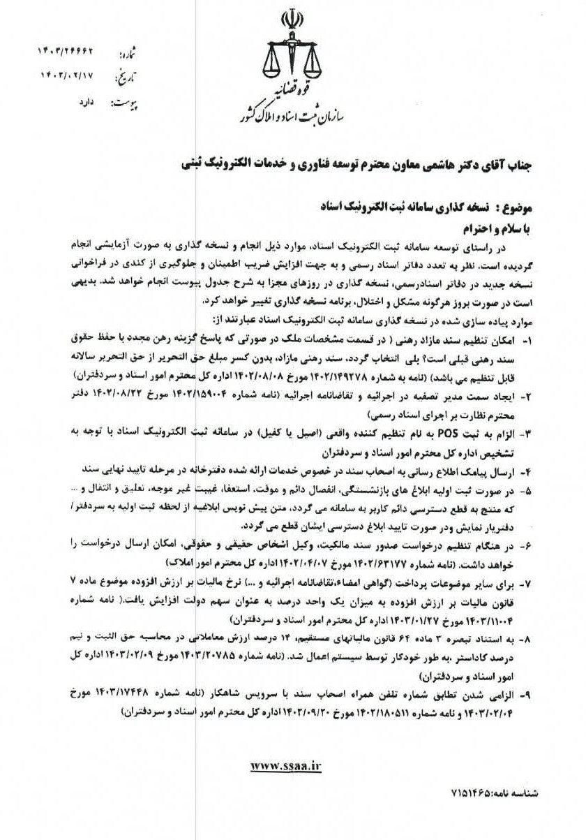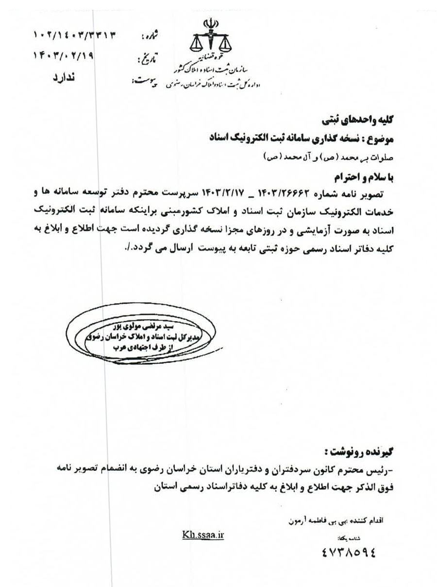 نسخه گذاری سامانه ثبت الکترونیک اسناد به صورت آزمایشی اخبار سایت بوسیله مدیر سایت به روز رسانی شده در اردیبهشت ۲۳, ۱۴۰۳ 0 تصویر نامه مدیر کل محترم ثبت استان با موضوع: نسخه گذاری سامانه ثبت الکترونیک اسناد به صورت آزمایشی در روزهای مجزا جهت استحضار دفاتر اسناد رسمی ⚜️روابط عمومی کانون سردفتران و دفتریاران خراسان رضوی⚜️ 🌐 سایت 📱 ایتا 📱 سروش 📱 تلگرام 📱 اینستاگرام