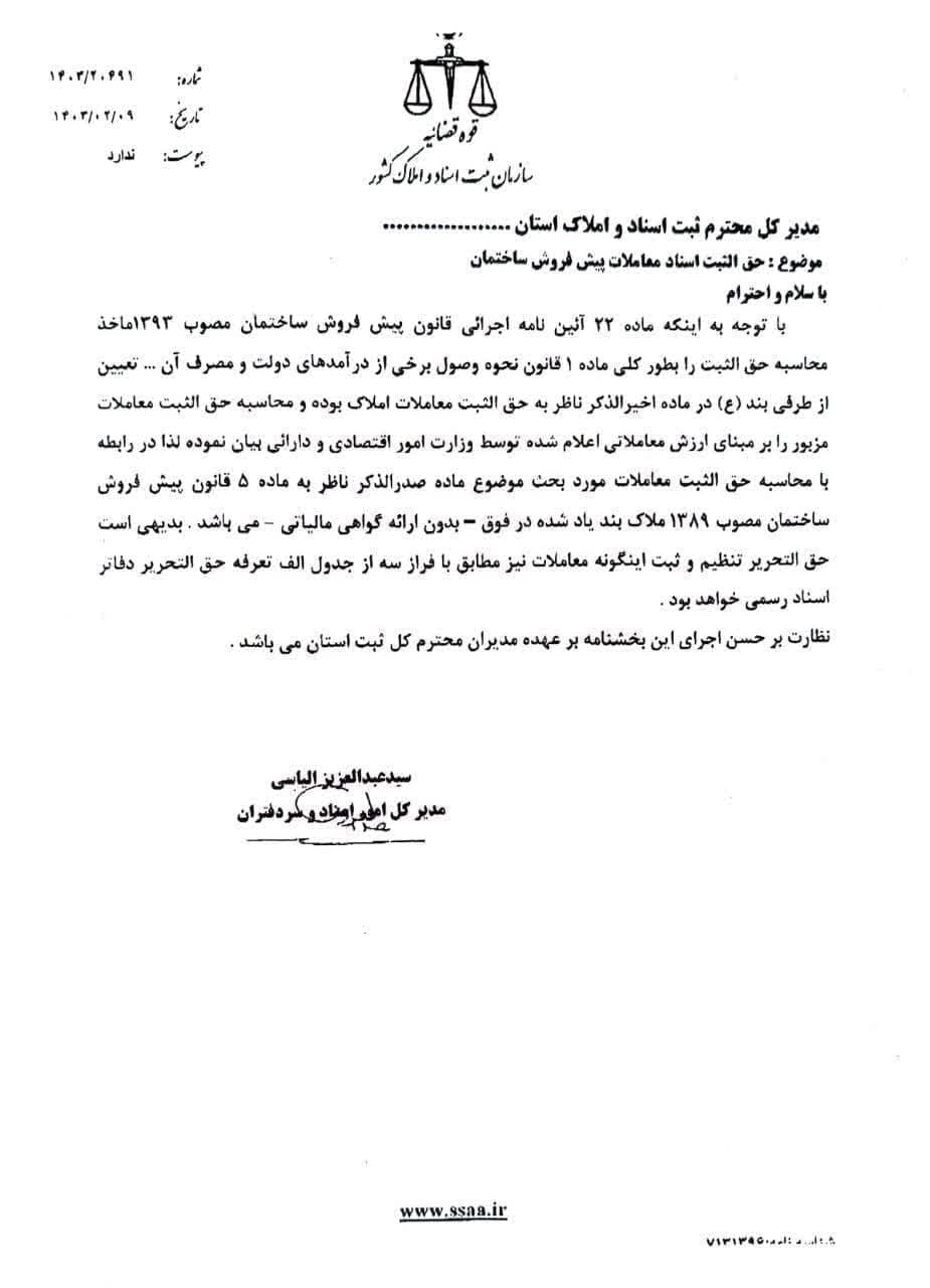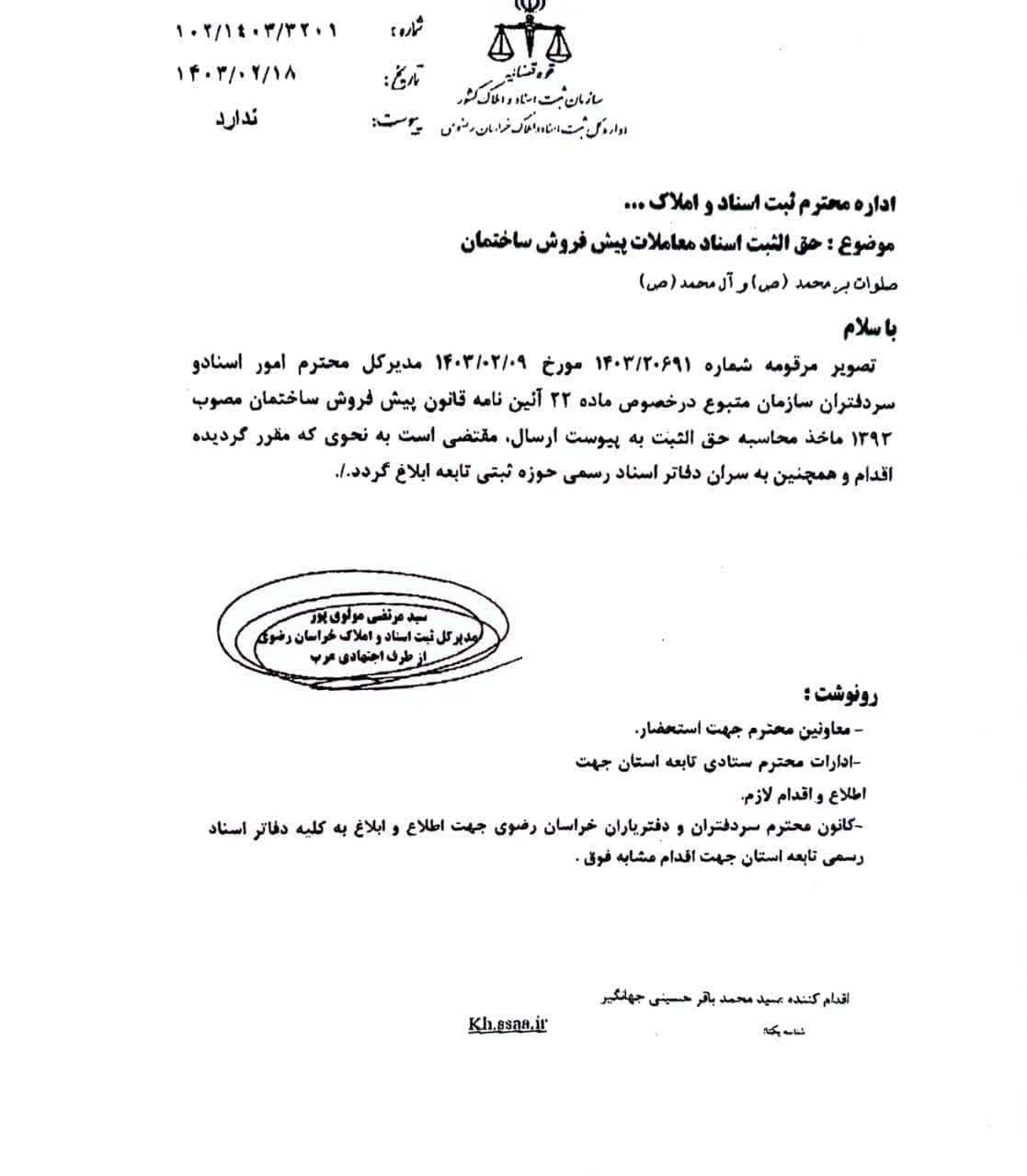 ماخذ محاسبه حق الثبت اسناد پیش فروش ساختمان اخبار سایتکمیته روابط عمومی ، رسانه و تشریفات بوسیله مدیر سایت در اردیبهشت ۲۶, ۱۴۰۳ 0 باسمه تعالی تصویر نامه شماره 1403/20691 مدیر کل محترم امور اسناد و سردفتران و نامه شماره 102/1403/3201 مدیر کل محترم ثبت استان با موضوع ماخذ محاسبه حق الثبت اسناد پیش فروش ساختمان ⚜️روابط عمومی کانون سردفتران و دفتریاران خراسان رضوی⚜️ 🌐 سایت 📱 ایتا 📱 سروش 📱 تلگرام 📱 اینستاگرام