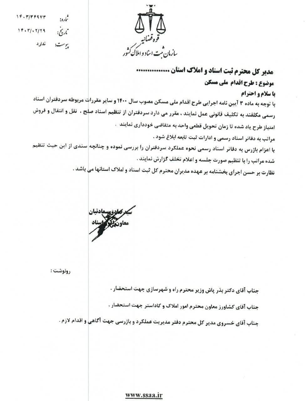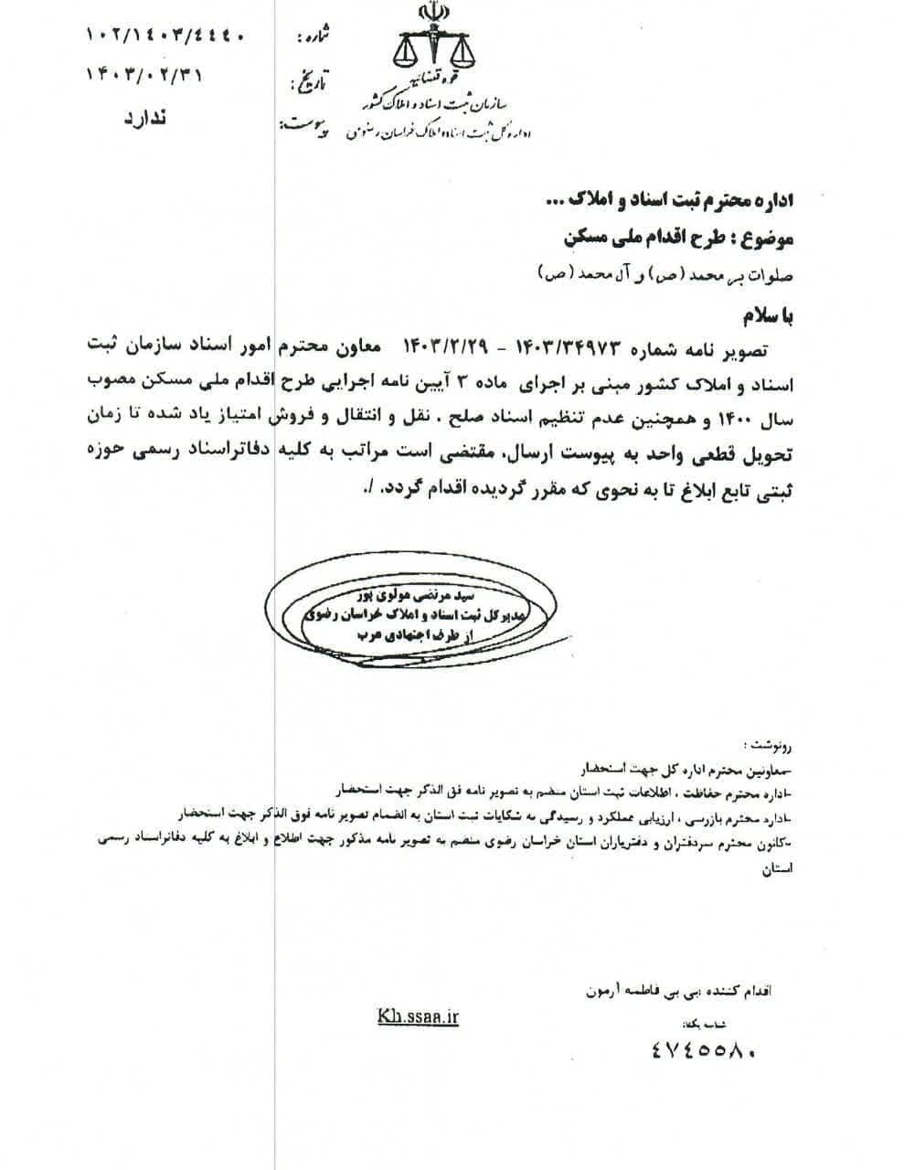 ممانعت از تنظیم اسناد صلح، نقل و انتقال و فروش اخبار سایتکمیته روابط عمومی ، رسانه و تشریفات بوسیله مدیر در خرداد ۷, ۱۴۰۳ 0 تصویر نامه شماره 102/1403/4440 مورخ 1403/02/31 اداره کل محترم ثبت اسناد و املاک خراسان رضوی در خصوص ممانعت از تنظیم اسناد صلح، نقل و انتقال و فروش امتیاز طرح اقدام مسکن مصوب سال 1400 ⚜️روابط عمومی کانون سردفتران و دفتریاران خراسان رضوی⚜️ 🌐 سایت 📱 ایتا 📱 سروش 📱 تلگرام 📱 اینستاگرام