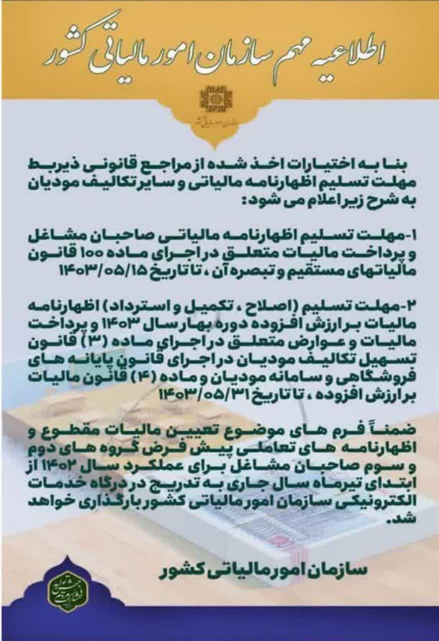 اطلاعیه مهم سازمان امور مالیاتی کشور در خصوص تغییر زمان ارسال اظهارنامه مالیاتی کمیته روابط عمومی ، رسانه و تشریفاتاخبار سایت بوسیله مدیر سایت به روز رسانی شده در خرداد ۱۷, ۱۴۰۳ 0 ⚜️روابط عمومی کانون سردفتران و دفتریاران خراسان رضوی⚜️ 🌐 سایت 📱 ایتا 📱 سروش 📱 تلگرام 📱 اینستاگرام