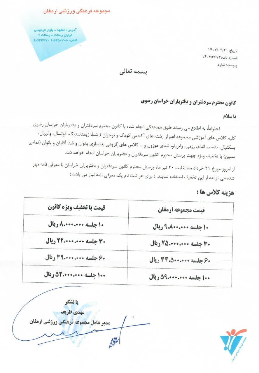 به اطلاع همکاران محترم میرساند بر اساس هماهنگی های انجام شده کمیته فرهنگی رفاهی ورزشی کانون سردفتران و دفتریاران استان خراسان رضوی با مجموعه فرهنگی ورزشی ارمغان تمام کلاس های آموزشی این مجموعه از تاریخ ۲۱ خرداد لغایت ۲۰ تیر در رشته های آکادمی کودک و نوجوان (شنا، ژیمناستیک، فوتسال، والیبال، بسکتبال، تناسب اندام، رزمی، واترپولو، شنای موزون….) و کلاس های گروهی بدنسازی بانوان، شنای آقایان و بانوان (برای تمام سنین) با تخفیف ویژه جهت استفاده سران دفاتر، دفتریاران و کارمندان دفاتر (و خانواده این افراد) ارائه میگردد.