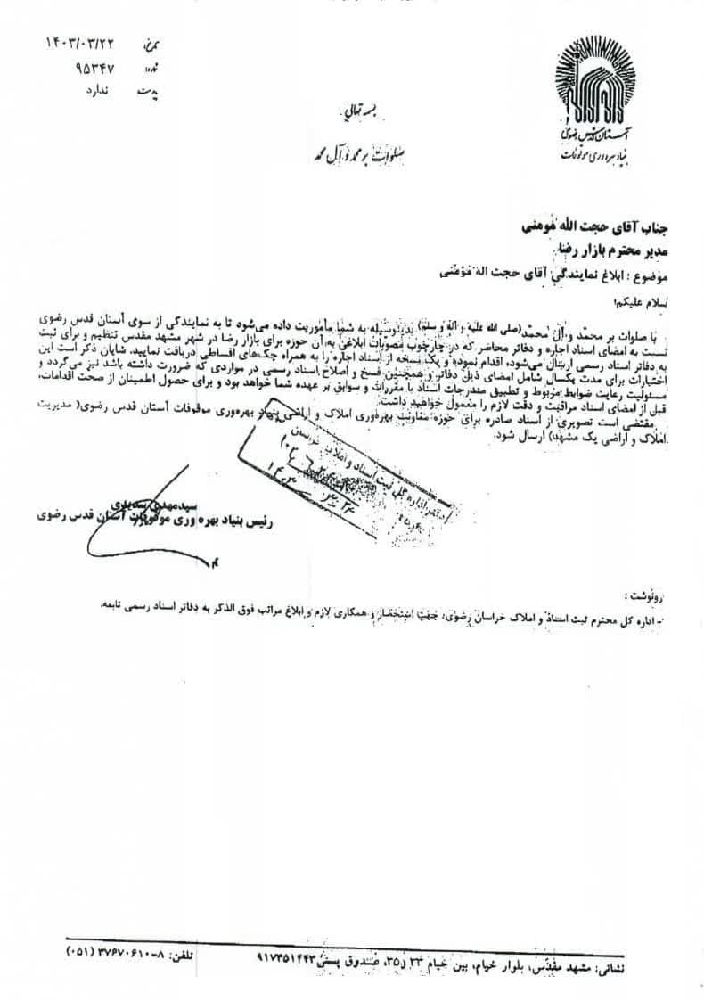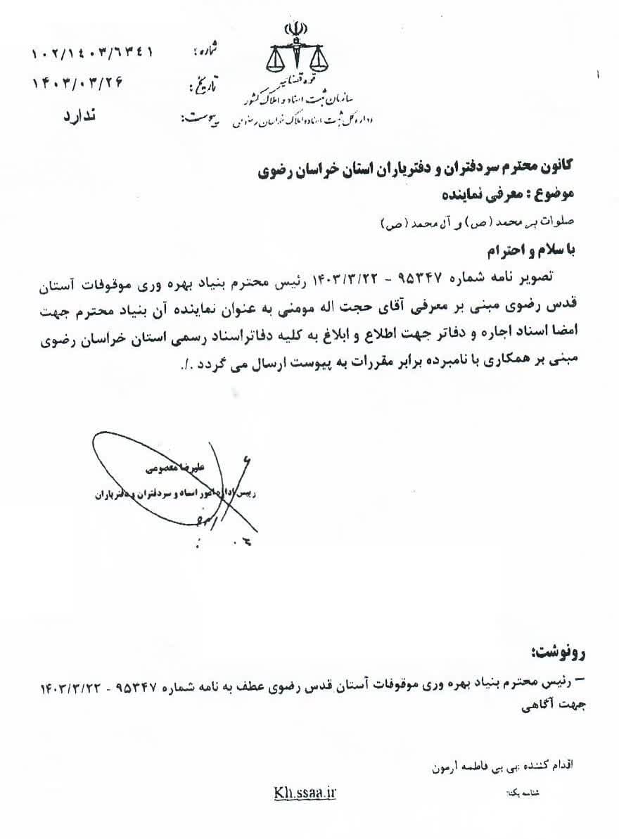 معرفی نماینده محترم بنیاد بهره وری موقوفات آستان قدس رضوی اخبار سایتکمیته روابط عمومی ، رسانه و تشریفات بوسیله مدیر سایت به روز رسانی شده در تیر ۲, ۱۴۰۳ 0 تصویر نامه شماره 102/1403/6341 اداره امور اسناد و سردفتران و دفتریاران خراسان رضوی مبنی بر معرفی آقای حجت اله مومنی به عنوان نماینده بنیاد بهره وری موقوفات آستان قدس رضوی جهت اطلاع همکاران. ⚜️روابط عمومی کانون سردفتران و دفتریاران خراسان رضوی⚜️ 🌐 سایت 📱 ایتا 📱 سروش 📱 تلگرام 📱 اینستاگرام