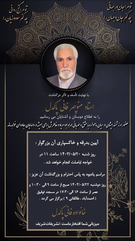 در کمال تأسف باخبر شدیم منوچهر فانی پاکدل (سردفتر سابق ۱۶ مشهد) دار فانی را وداع گفتند.