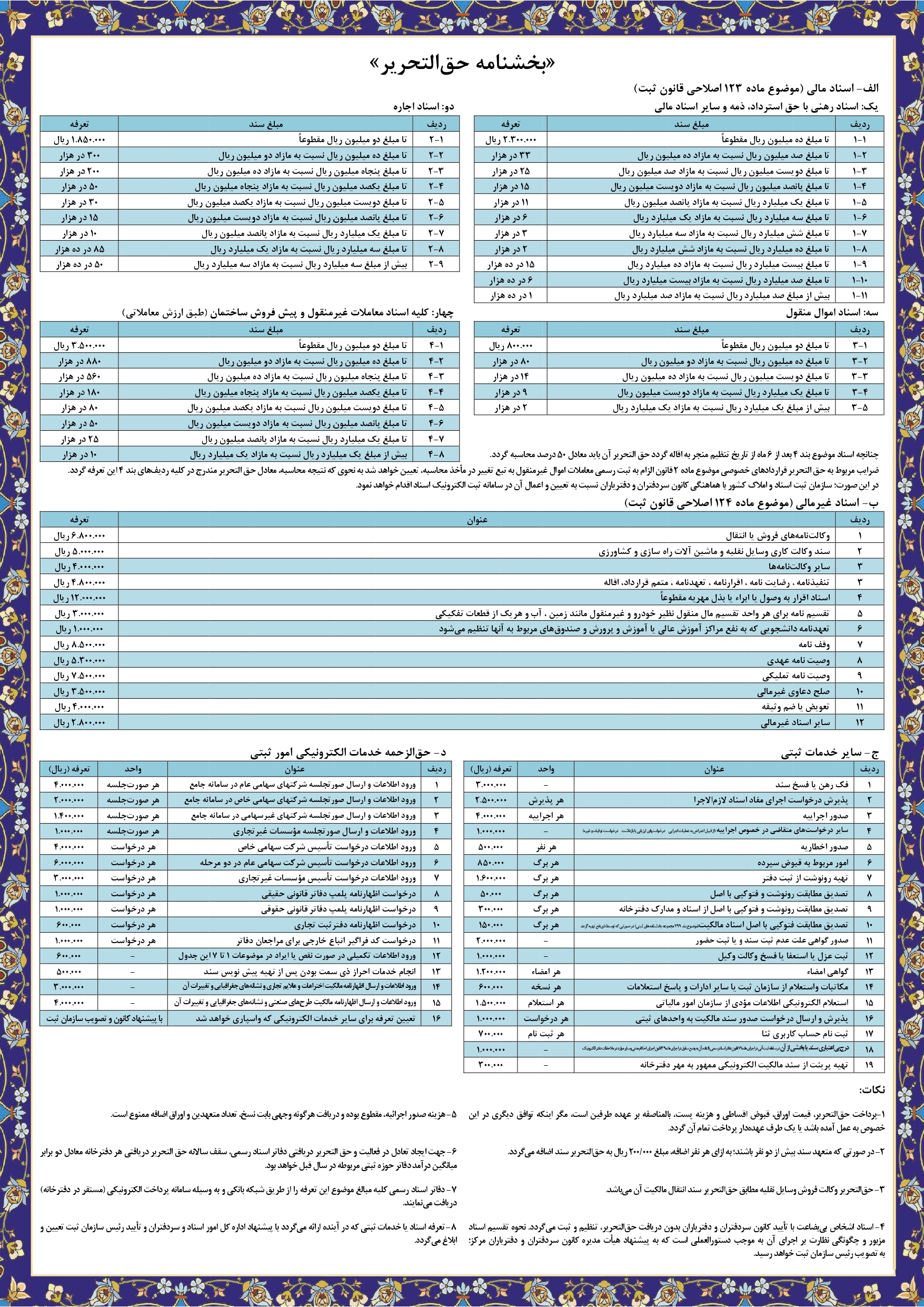 بدینوسیله ضمن اعلام ابلاغ تعرفه حق التحریر دفاتر اسناد رسمی به اطلاع میرساند این تغییرات از ۳۱ مرداد ماه ۱۴۰۳ در سراسر کشور قابل اجرا و لازم الرعایه می باشد.