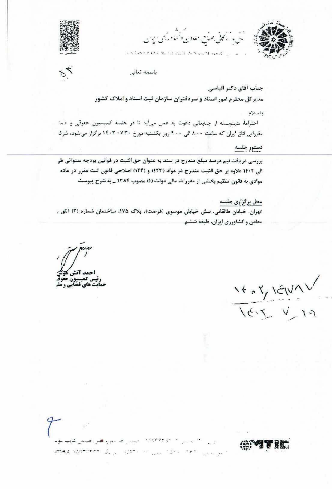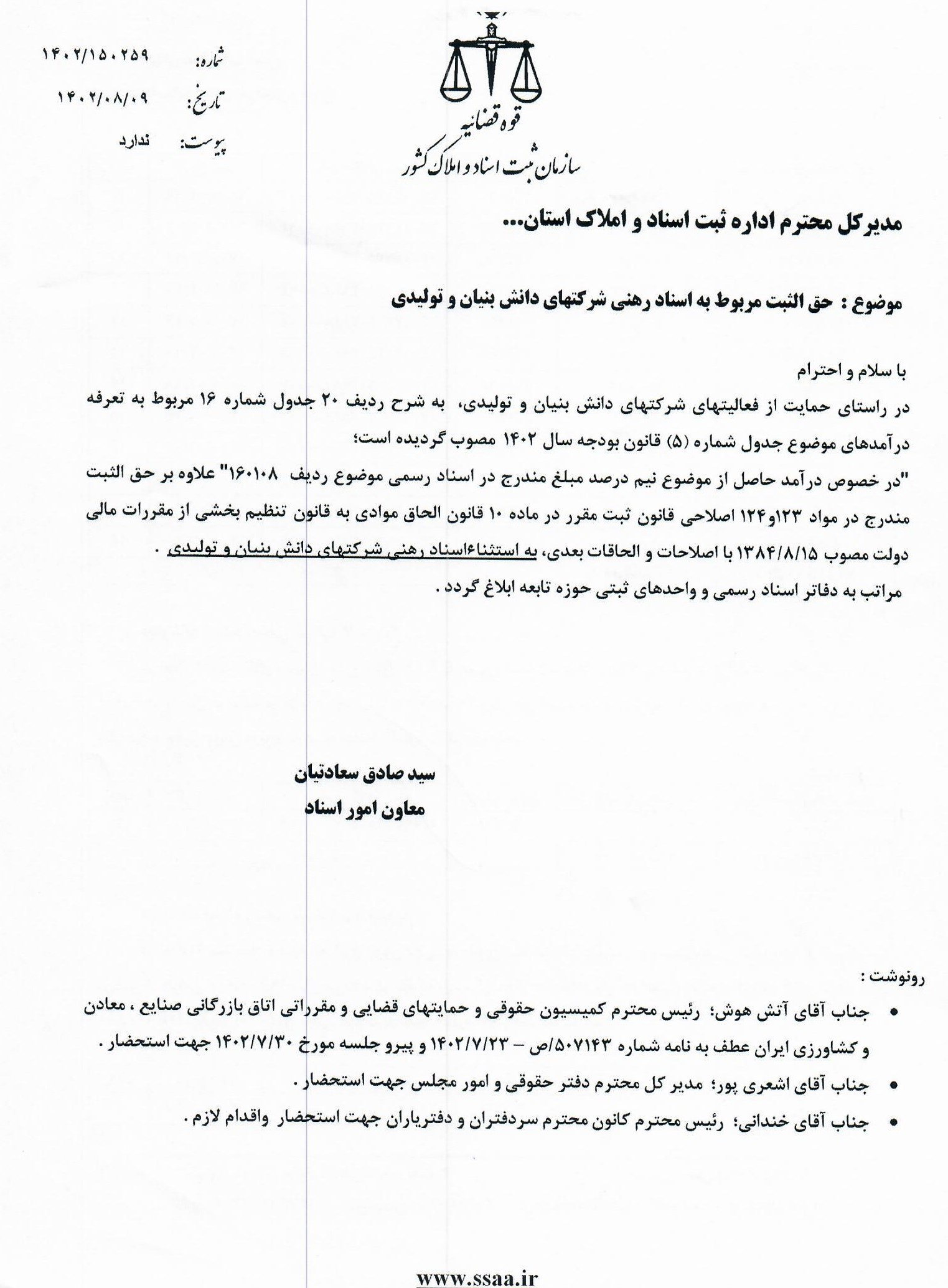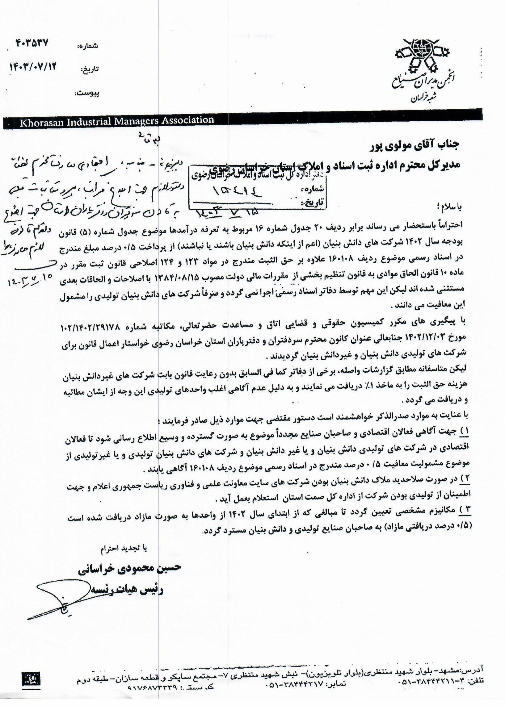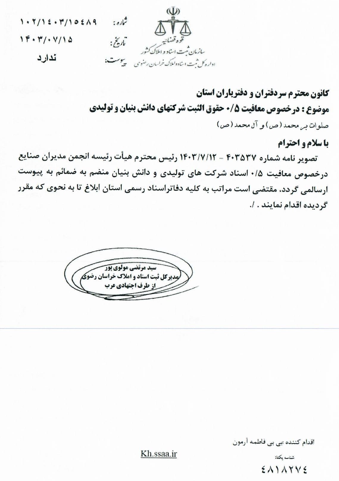در خصوص معافیت مبلغ نیم درصد اسناد شرکت های تولیدی و دانش بنیان اخبار سایتکمیته روابط عمومی ، رسانه و تشریفات بوسیله مدیر سایت به روز رسانی شده در مهر ۲۶, ۱۴۰۳ 0 نامه شماره 102/1403/15489 مورخ 1403/07/15 مدیر کل محترم ثبت استان (منضم به ضمائم) در خصوص معافیت مبلغ نیم درصد اسناد شرکت های تولیدی و دانش بنیان. ⚜️روابط عمومی کانون سردفتران و دفتریاران خراسان رضوی⚜️ 🌐 سایت 📱 ایتا 📱 سروش 📱 تلگرام 📱 اینستاگرام