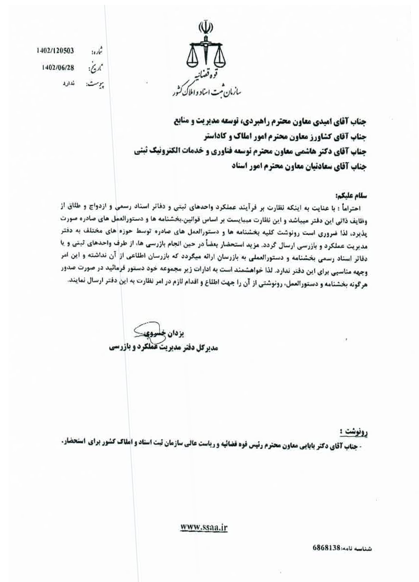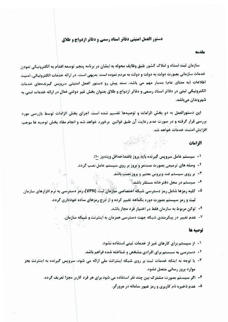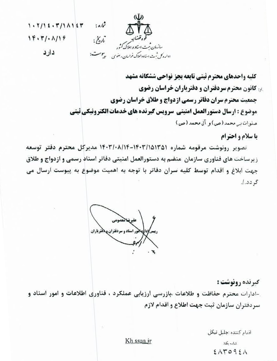 تصویر نامه شماره ۱۰۲/۱۴۰۳/۱۸۱۴۳ مورخ ۱۴۰۳/۰۸/۱۶ اداره کل ثبت اسناد و املاک خراسان رضوی با موضوع دستورالعمل امنیتی جهت ابلاغ به دفاتر اسناد رسمی و دفاتر ازدواج و طلاق جهت استحضار و رعایت مفاد آن با توجه به اهمیت موضوع