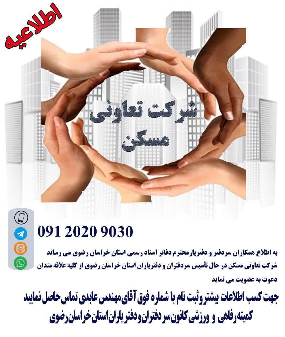 شرکت تعاونی مسکن در حال تاسیس از کلیه علاقه مندان دعوت به عضویت می نماید، به استحضار می رساند ظرفیت محدود و اولویت با کسانی است که زودتر ثبت نام و مدارک خود را تکمیل نمایند.