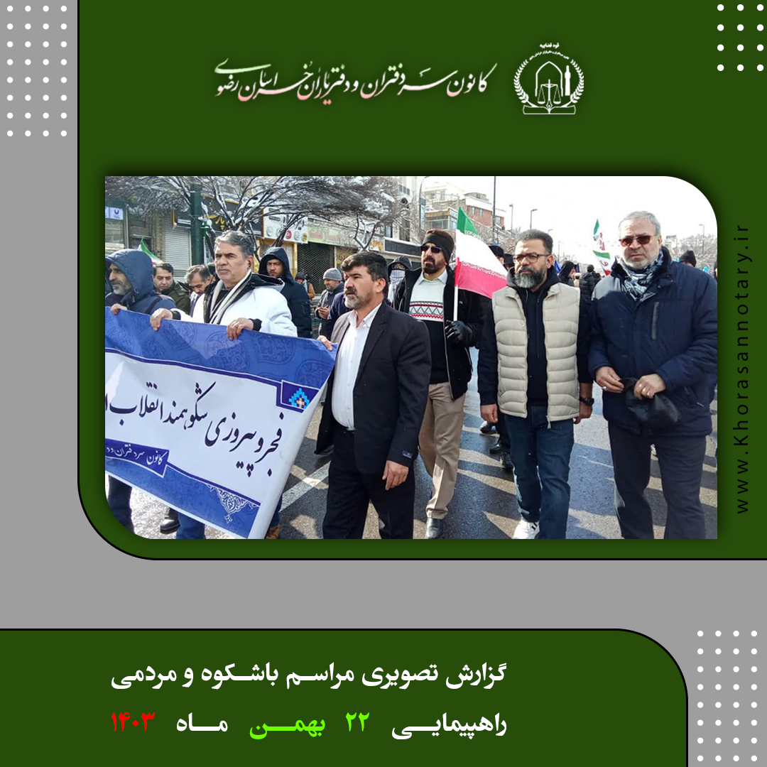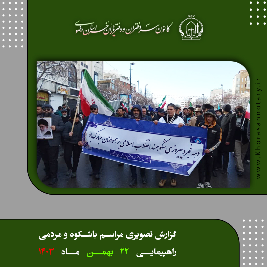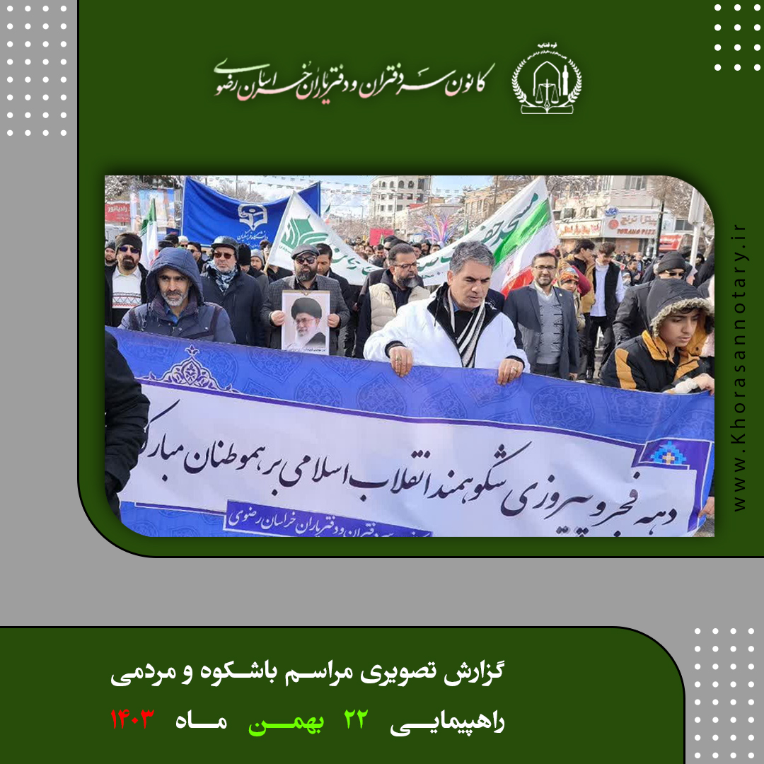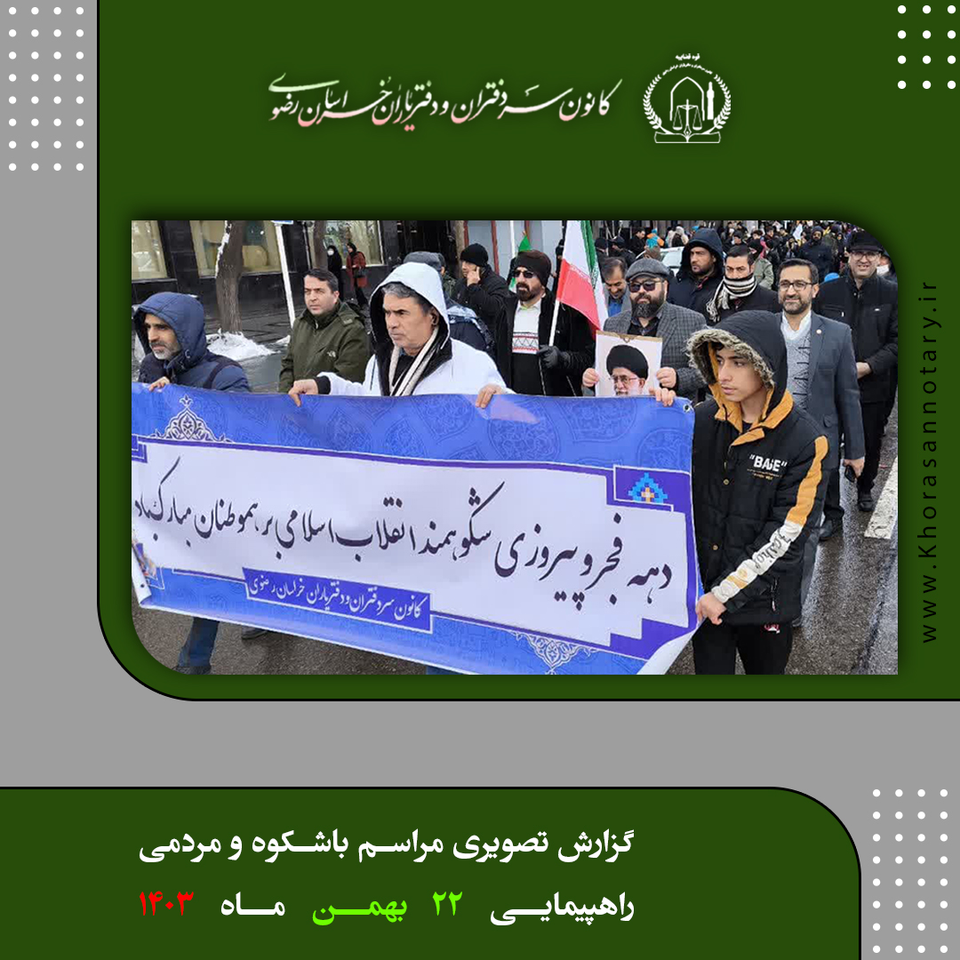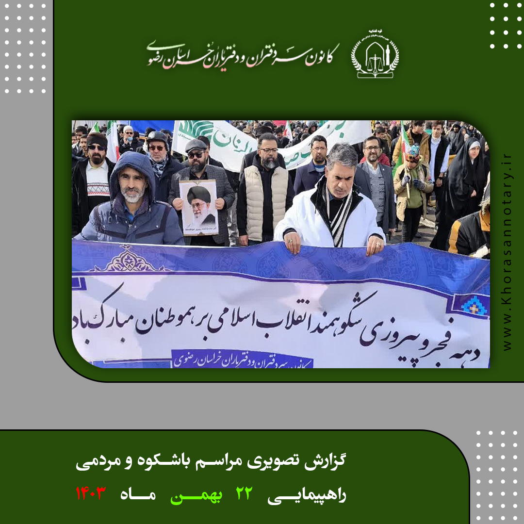گزارش تصویری مراسم باشکوه و مردمی اخبار سایتکمیته روابط عمومی ، رسانه و تشریفات بوسیله مدیر سایت در بهمن ۲۳, ۱۴۰۳ 0 گزارش تصویری مراسم باشکوه و مردمی راهپیمایی 22 بهمن ماه 1403 ⚜️روابط عمومی کانون سردفتران و دفتریاران خراسان رضوی⚜️ 🌐 سایت 📱 ایتا 📱 سروش 📱 تلگرام 📱 اینستاگرام