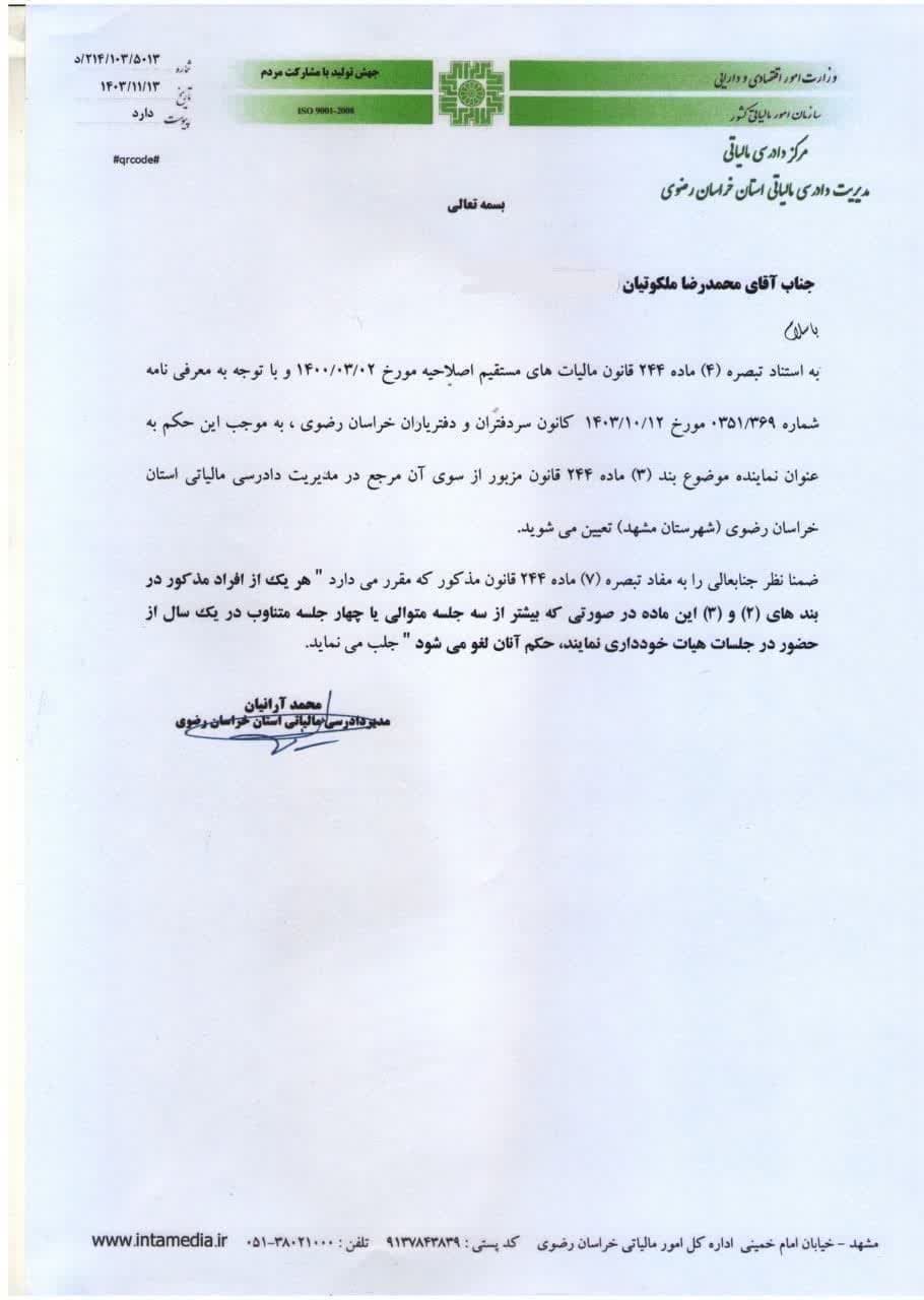 با معرفی کانون آقای محمد رضا ملکوتیان به عنوان نماینده دفاتر اسناد رسمی خراسان رضوی (موضوع بند سه ماده 244 ق.م.م) در هیات های حل اختلاف مالیاتی منصوب شد. بایسته است همکاران گرامی که برای ایشان از جانب سازمان امور مالیاتی کیفر خواست صادر می شود قبل از مواعد قانونی مراتب را به کمیته مالیاتی کانون منعکس نمایند.