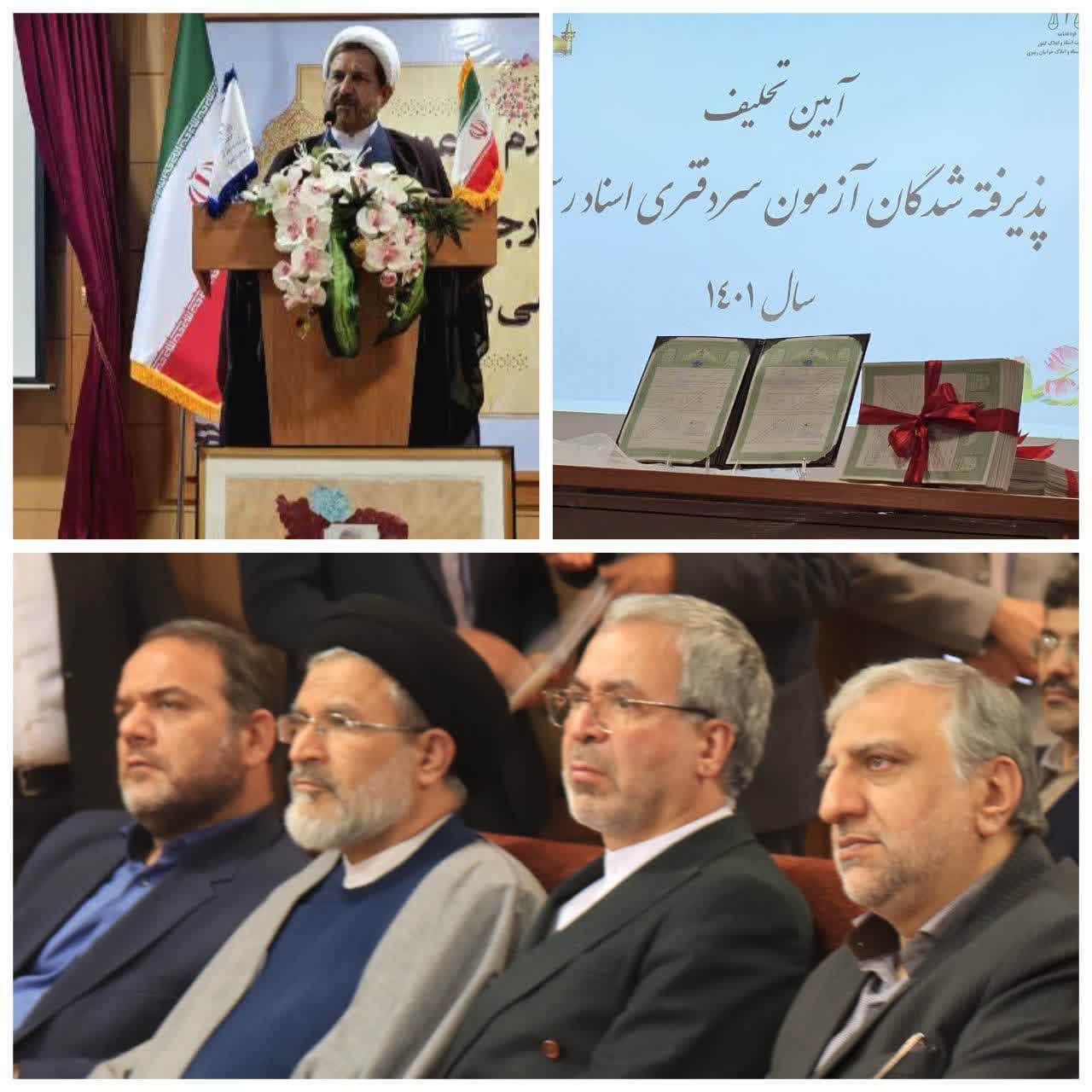 آیین تحلیف پذیرفته شدگان آزمون سردفتری اسناد رسمی سال ۱۴۰۱ و همچنین مراسم تحویل ۲۰۰۰ برگ سند مالکیت حدنگار شرکت شهرکهای صنعتی خراسان رضوی برگزار شد.
