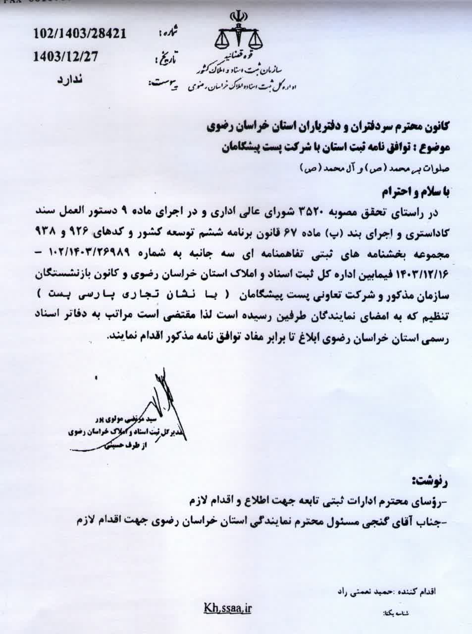 تصویر نامه شماره ۱۰۲/۱۴۰۳/۲۸۴۲۱ مورخ ۱۴۰۳/۱۲/۲۷ اداره کل ثبت اسناد و املاک استان با موضوع تفاهم نامه سه جانبه فی مابین اداره کل ثبت خراسان رضوی، کانون بازنشستگان سازمان ثبت و شرکت تعاونی پست پیشگامان جهت اطلاع همکاران و همکاری با نمایندگان شرکت پارسی پست.