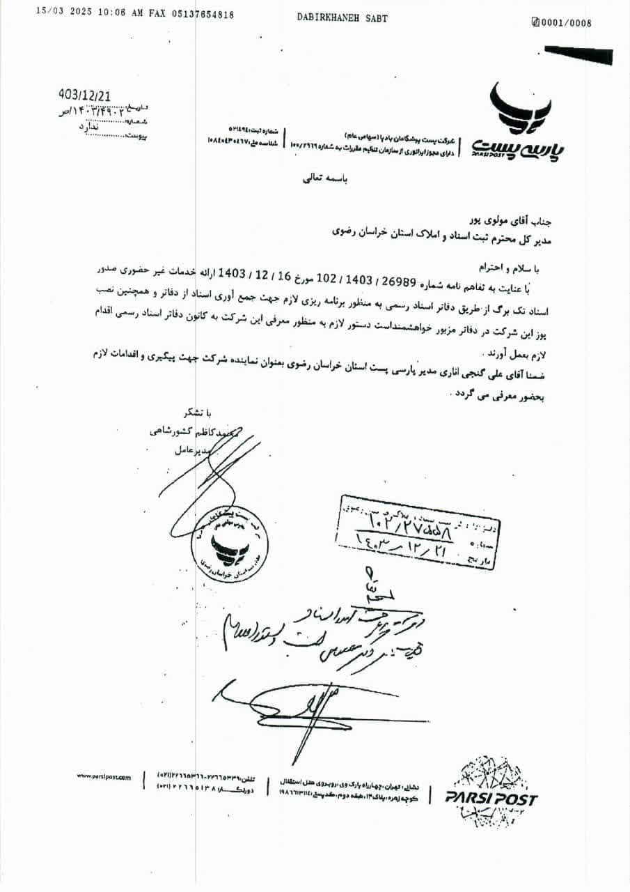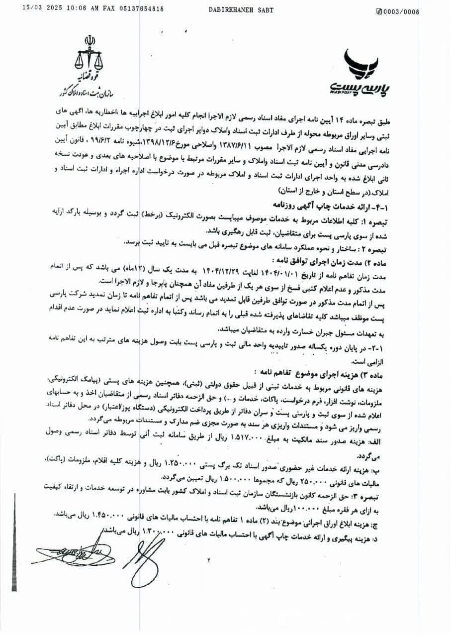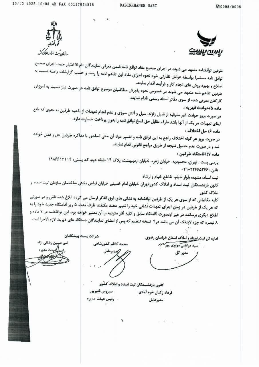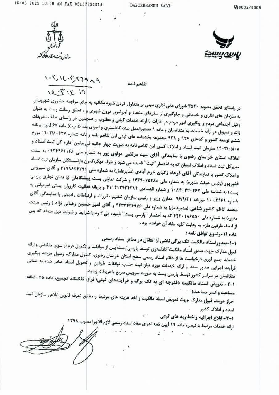 تصویر تفاهم نامه با شرکت تعاونی پست پیشگامان اخبار سایتکمیته روابط عمومی ، رسانه و تشریفات بوسیله مدیر سایت به روز رسانی شده در فروردین ۶, ۱۴۰۴ 0 تصویر تفاهم نامه سه جانبه فی مابین اداره کل ثبت خراسان رضوی، کانون بازنشستگان سازمان ثبت و شرکت تعاونی پست پیشگامان جهت اطلاع همکاران و همکاری های لازم با نمایندگان شرکت پارسی پست. ⚜️روابط عمومی کانون سردفتران و دفتریاران خراسان رضوی⚜️ 🌐 سایت 📱 ایتا 📱 سروش 📱 تلگرام 📱 اینستاگرام